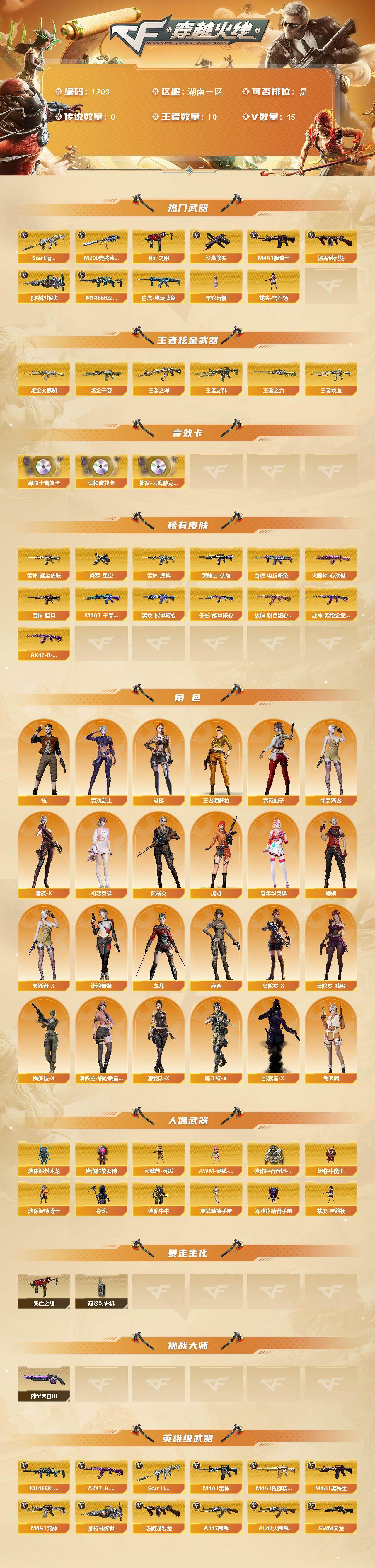 [16603083]湖南一区-51V-10王者武器数-2炫金武器数 【热门武器】:M14EBR-玄武,Scar Light-白虎,M200-竞技荣光,死亡之眼,白虎-电玩蓝兔,M4A1-黑骑士,汤姆逊-烈龙*4,加特林-炼狱*2,羊驼玩偶*2,裁决-雪莉杨,沙鹰-修罗*2 【王者炫金武器】:王者之戮,王者之翼,王者龙血,王者之力,炫金火麒麟,炫金千变 【音效卡】:修罗-云海游龙音效卡,M4A1-雷神音效卡,M4A1-黑骑士音效卡 【皮肤】:白虎-电玩粉兔皮肤,雷神-暗月,雷神-虎将,雷神-耀金皮肤,火麒麟-心动糖果,M4A1-千变-孔明皮肤,黑龙-能量核心,黑骑士-伏羲,无影-能量核心,战神-粉色甜心皮肤,战神-紫绶金章皮肤,AK47-B-常胜将军-曹操,修罗-星空*2 【角色】:魅影,炫,王者潘多拉,暗夜-X,初恋灵狐,风暴女,虎妞,嘉年华灵狐,娟娟,灵动武士,灵狐者-X,流浪蔷薇,龙儿,麻雀,曼陀罗-X,曼陀罗-礼服,潘多拉-X,潘多拉-甜心教官,潜龙队-X,青霞仙子,斯沃特-X,兔囡囡,新灵狐者,影武者-X 【人偶武器】:裁决-雪莉杨,火麒麟-灵狐,AWM-灵狐-15周年嘉年华,迷你深渊冰龙,迷你牛魔王,迷你波特博士*2,夺魂,迷你牛牛,深渊终结者手雷*2,迷你超能女侍,迷你巨石泰坦-魔花研究所,灵狐娃娃手雷 【暴走生化】:死亡之眼,超级对讲机 【挑战大师】:神圣爆裂者-末日III 【英雄级武器】:AK47-火麒麟*2,AK47-麒麟,M4A1-雷神,M4A1-黑骑士,M4A1-死神*2,Scar Light-白虎,M14EBR-玄武,无影-神兵利器,黑武士-锦绣游龙,M4A1-玫瑰精灵*2,王者之武-觉醒版,AK-47-猩红传说,王者冰魄-觉醒版,AK47-B-常胜将军,QBZ-03-王者蔷薇-觉醒版,白虎-电玩蓝兔,王者芳薇-觉醒版,AWM-天龙*2,Barrett-毁灭,AWM-裁决,M200-竞技荣光,王者星神-觉醒版,加特林-炼狱*2,汤姆逊-烈龙*4,AA-12-雷霆,沙鹰-修罗*2,沙鹰-天神,屠龙*2,擎天,麒麟刺,王者之刺-觉醒版,高爆手雷-幻灵,闪光弹-幻灵,闪光弹-竞技荣光,烟雾弹-幻灵,烟雾弹-竞技荣光 【道具】:全能枪王背包,炫彩背包,女皇终结者-魔龙之吻,绿色巨人,灵魂忍者,变异宝贝,迷雾幽灵,生化弹匣,夺命之镰,防化服*4,金色流光-枪王排位*2,