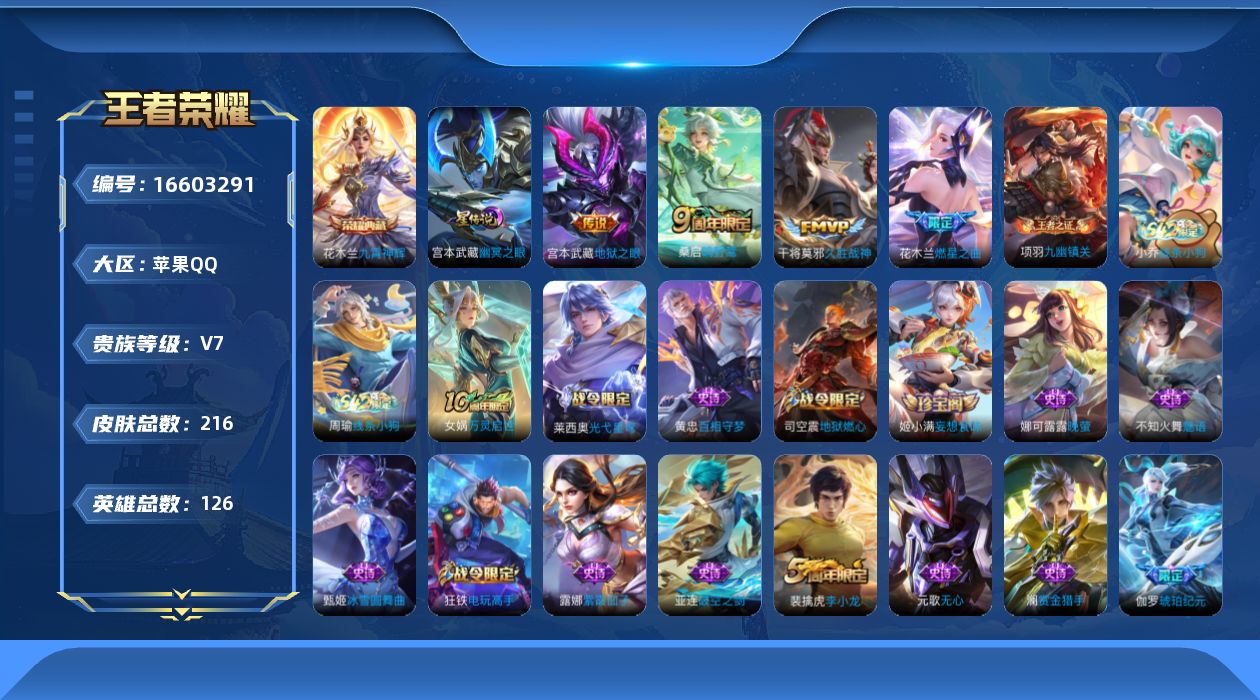 [16603291]【特价急出/详情看图】苹果Q-V7-至尊星耀IV段位-126英雄-216皮肤-1典藏皮肤-1星元-4传说-61史诗