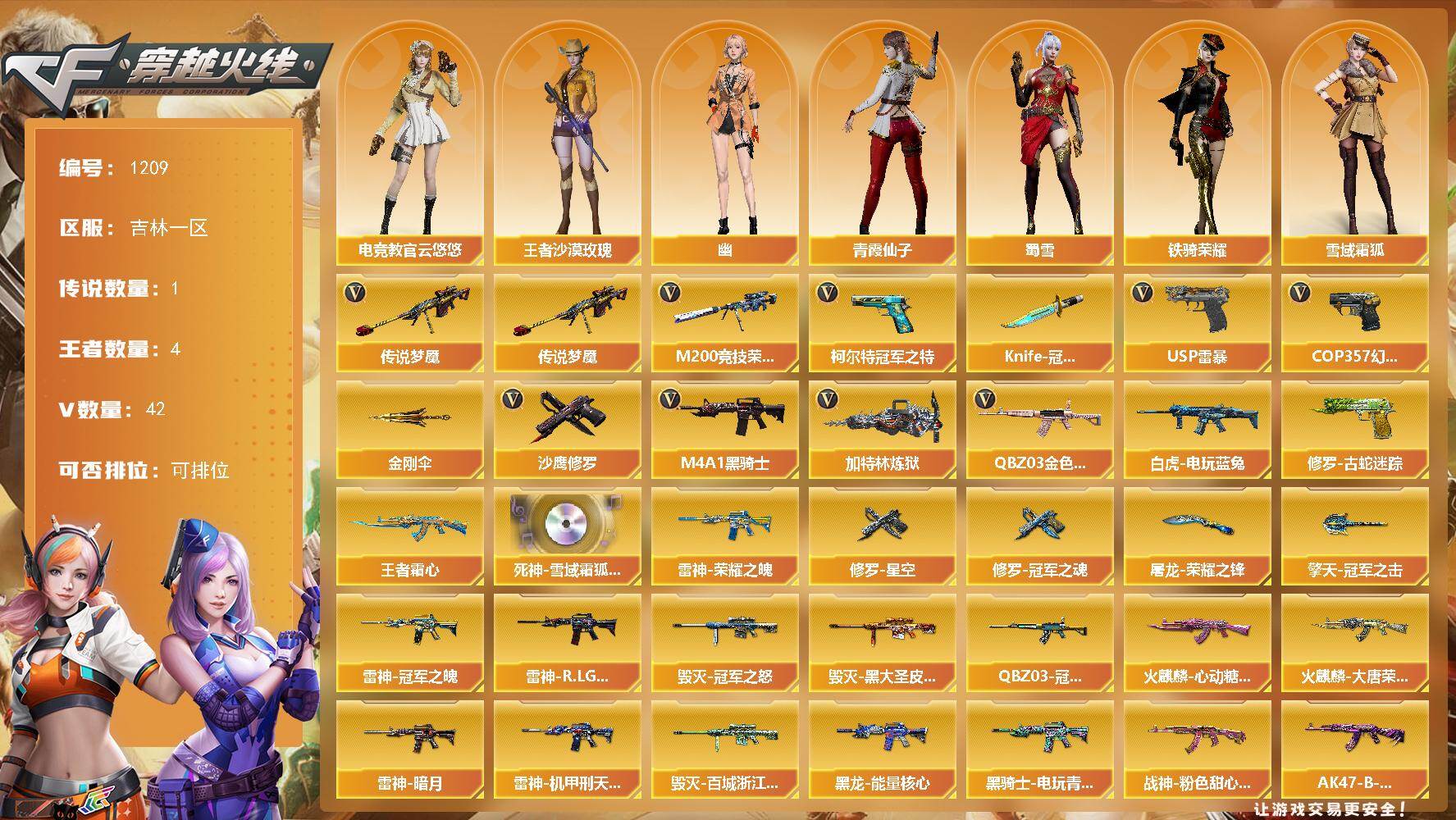 [16604272]吉林一区-42V-4王者武器数-0炫金武器数 【传说武器】:传说梦魇 【热门武器】:传说梦魇,QBZ03-金色蔷薇,修罗-古蛇迷踪,M200-竞技荣光,白虎-电玩蓝兔,柯尔特-冠军之特,M4A1-黑骑士,加特林-炼狱,USP-雷暴,COP 357-幻灵,沙鹰-修罗*3,Knife-冠军之刃,金刚伞 【王者炫金武器】:王者霜心 【音效卡】:死神-雪域霜狐-怀旧音效卡 【皮肤】:幻神-电竞之星 皮肤,QBZ03-冠军之薇,雷神-暗月,雷神-荣耀之魄,雷神-冠军之魄,雷神-R.LGD-CFPLS18冠军,雷神-机甲刑天皮肤,火麒麟-大唐荣光,火麒麟-心动糖果,毁灭-冠军之怒,毁灭-黑大圣皮肤*3,毁灭-百城浙江 皮肤,黑龙-能量核心,黑骑士-电玩青兔皮肤,战神-粉色甜心皮肤,AK47-B-常胜将军-曹操*2,炼狱-月 皮肤,修罗-星空,修罗-冠军之魂*3,屠龙-荣耀之锋,擎天-冠军之击 【角色】:电竞教官-云悠悠,王者沙漠玫瑰,雪域霜狐,蛇隐宗,乔伊教练,暗夜-X,初恋灵狐,芳心审判者,风暴女,虎妞,嘉年华灵狐,娟娟,0号玩家,灵狐者-X,灵狐者-黄金海岸,灵狐者-七夕宝贝,龙儿-小淘气,麻雀,潘多拉-X,潘多拉-甜心教官,青霞仙子,蛇姬,斯沃特-X,蜀雪,铁骑荣耀,樱-战斗天使,影武者-X,幽 【人偶武器】:星神-炽天使,M37-葵,COP-旗袍,迷你裂空之翼,生化手雷-机甲核心*2,迷你艾比 【暴走生化】:超级对讲机 【挑战大师】:激光毁灭者III-白马银枪,试炼破坏者III,神圣爆裂者-末日III,阐释者III 【英雄级武器】:AK47-火麒麟,M4A1-雷神,M4A1-黑骑士,AN94-超新星,QBZ03-金色蔷薇,王者之烈-觉醒版,白虎-电玩蓝兔,Barrett-毁灭,M200-竞技荣光,王者之决-觉醒版,王者风神-觉醒版,加特林-炼狱,沙鹰-修罗*3,USP-雷暴,COP 357-幻灵,柯尔特-冠军之特,柯尔特-竞技荣光,修罗-古蛇迷踪,屠龙,擎天,幻灵之锋,擎天-竞技荣光,屠龙-动感闪耀,高爆手雷-幻灵*2,高爆手雷-竞技荣光*4,闪光弹-幻灵*2,闪光弹-竞技荣光*4,烟雾弹-竞技荣光,M4A1-赤狱骑士 【道具】:AG战队炫彩背包,CFS限定背包,亚洲杯纪念炫彩背包,冰冰企鹅背包-猛男专用,古蛇迷踪炫彩背包,炫彩背包-诺拉,炫彩背包,虎牙炫彩背包,雪域