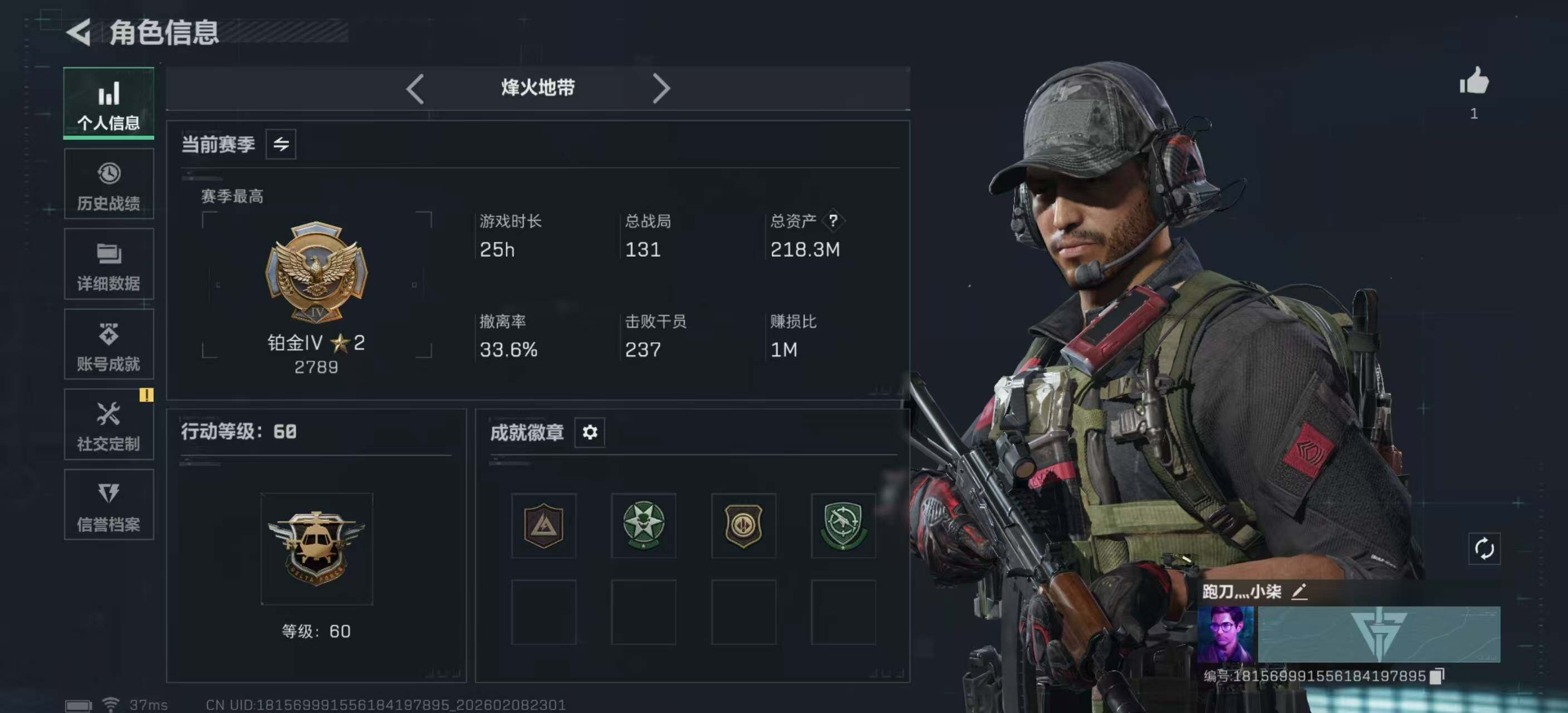 [16605488]【特价出售/店主推荐】218m总资产-105931k哈伏币-60烽火等级-铂金-1战场等级-无军衔
