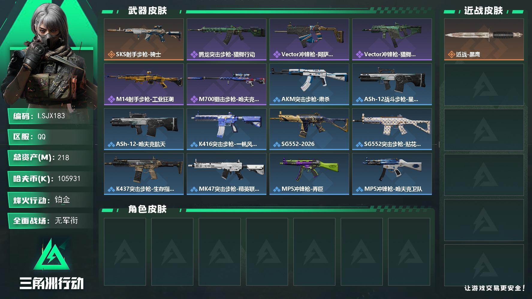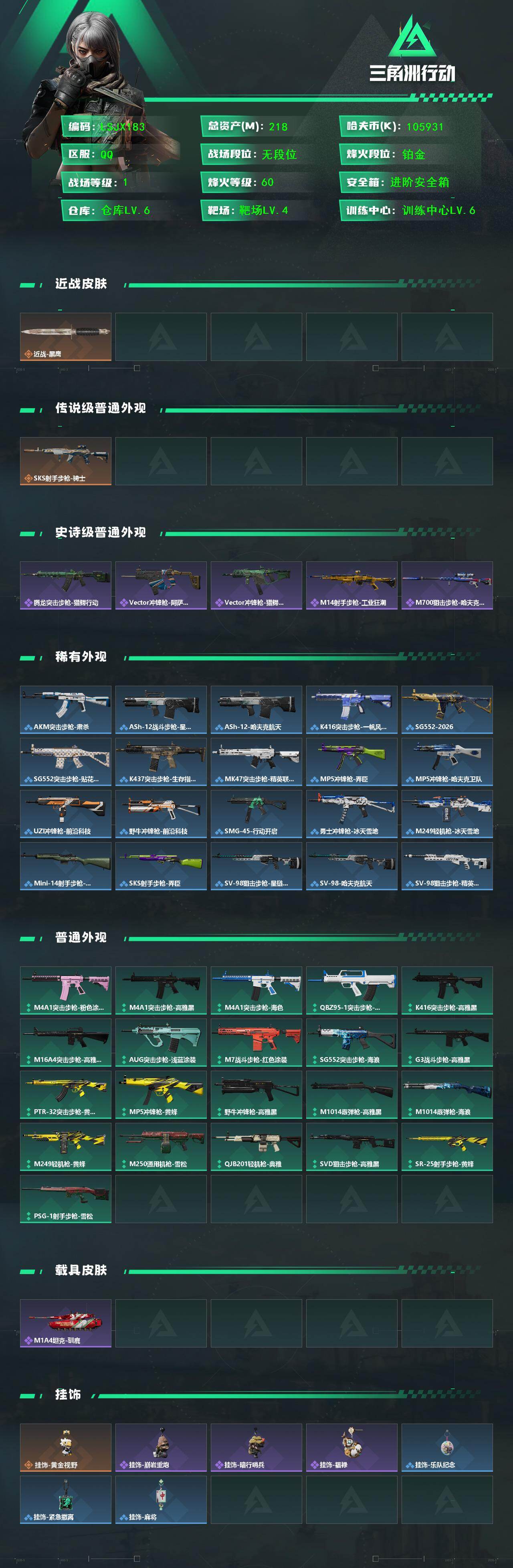 [16605488]【特价出售/店主推荐】218m总资产-105931k哈伏币-60烽火等级-铂金-1战场等级-无军衔 【近战皮肤】:近战-黑鹰 【传说外观】:SKS射手步枪-骑士 【史诗外观】:腾龙突击步枪-猎鳄行动,Vector冲锋枪-阿萨拉文明,Vector冲锋枪-猎鳄行动,M14射手步枪-工业狂潮,M700狙击步枪-哈夫克警备 【稀有外观】:AKM突击步枪-肃杀,ASh-12战斗步枪-星链科技,ASh-12战斗步枪-哈夫克航天,K416突击步枪-一帆风顺,SG552突击步枪-2026,SG552突击步枪-贴花艺术,K437突击步枪-生存指令,MK47突击步枪-精英联盟,MP5冲锋枪-弄臣,MP5冲锋枪-哈夫克卫队,UZI冲锋枪-前沿科技,野牛冲锋枪-前沿科技,SMG-45-行动开启,勇士冲锋枪-冰天雪地,M249轻机枪-冰天雪地,Mini-14射手步枪-荣耀列队,SKS射手步枪-弄臣,SV-98狙击步枪-星链科技,SV-98狙击步枪-哈夫克航天,SV-98狙击步枪-精英联盟 【普通外观】:M4A1突击步枪-粉色涂装,M4A1突击步枪-高雅黑,M4A1突击步枪-海色,QBZ95-1突击步枪-海色,QBZ95-1突击步枪-2026,K416突击步枪-高雅黑,M16A4突击步枪-高雅黑,AUG突击步枪-浅蓝涂装,M7战斗步枪-红色涂装,SG552突击步枪-海浪,G3战斗步枪-高雅黑,PTR-32突击步枪-黄蜂,MP5冲锋枪-黄蜂,野牛冲锋枪-高雅黑,M1014霰弹枪-高雅黑,M1014霰弹枪-海浪,M249轻机枪-黄蜂,M250通用机枪-雪松,QJB201轻机枪-典雅,SVD狙击步枪-高雅黑,SR-25射手步枪-黄蜂,PSG-1射手步枪-雪松,G17-2026 【载具外观】:M1A4坦克-驯鹿 【挂饰】:挂饰-黄金视野,挂饰-崩岩重炮*4,挂饰-暗行哨兵*9,挂饰-福禄*3,挂饰-乐队纪念*2,挂饰-紧急撤离*28,挂饰-麻将*7