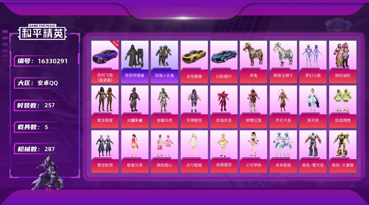[16330291]【特价出售/店主推荐】安卓 手Q-30粉装-8特效枪-5载具-10粉色飞行器-117885热力值-15王牌印记-257套装-287枪皮 【红色载具】:宾利飞驰(皇家紫)(三级) 【热门品类】:粉装-梦幻火箭,粉装-缤纷油彩,粉装-繁龙极客,套装-浪漫天命,套装-深海小丑鱼,套装-小丑鱼,套装-奇异狩猎者,角色-军刀雅典娜,套装-忍者信条,角色-2B战斗服款,套装-SS1特训,角色-忠猛周仓,角色-忠真马岱,角色-忠义严颜,套装-六号树人,套装-龟仙人,套装-浪漫波比,套装-粉红小猪,套装-摄影小熊猫,套装-红红火火,大砍刀-青龙偃月刀,撬棍-龙胆亮银枪,熔岩游骑兵连帽夹克 【粉色套装】:粉装-火曜朱雀,粉装-金曜白虎,粉装-梦幻火箭,粉装-缤纷油彩,粉装-天禅智恒,粉装-炙焰赤龙,粉装-桀骜红莲,粉装-齐天大圣,角色-洛天依,粉装-恐龙拽拽,粉装-青空秋雨,角色-歌者泠鸢,粉装-飒粉甜心,角色-白勺歌姬,角色-呆萌星弥,角色-小可学妹,粉装-未来歌姬,角色-擎天柱,角色-大黄蜂,角色-阿尔茜,角色-猩猩队长,粉装-拂晓神骑,粉装-闲梦青缨,粉装-炫光之旅,角色-宙之时溯,角色-星云暗核,角色-冰炎战车,角色-紫钛骑兵,玩偶服-猪猪侠,粉装-繁龙极客 【粉色枪皮等级】:AKM-星际浪客(一级),AKM-白勺歌姬(六级),M416-五爪金龙(七级),野牛-青空秋雨(七级),P90-沙丘之主(三级),Kar98K-巳巳如意(五级),AMR-炫光之旅(二级),PKM-天星战神(四级) 【粉色载具】:宾利飞驰(皇家紫),永恒黄蜂,幻影随行,赤兔,照夜玉狮子 【粉色枪皮】:AKM-星际浪客,AKM-白勺歌姬,M416-五爪金龙,野牛-青空秋雨,P90-沙丘之主,Kar98K-巳巳如意,AMR-炫光之旅,PKM-天星战神 【粉色飞行器】:梦幻火箭飞行器,机甲封神飞行器,齐天大圣飞行器,歌者泠鸢飞行器,黄族统领飞行器,璀璨巨星飞行器,沙丘之主天马,繁龙极客飞行器 【粉色降落伞】:幻影战神降落伞,梦幻火箭降落伞,华贵君王降落伞,伏魔团降落伞,繁花小夜曲降落伞,四圣焕新降落伞,心之恋语降落伞,激战未来降落伞,怪笑疯兔降落伞,机甲封神降落伞,暗夜玫瑰降落伞,齐天大圣降落伞,洛神天依降落伞,红伞翩翩降落伞,蓝莓炮弹降落伞,恐龙拽拽降落伞,幻梦音符降落伞,炙焰牛王降落伞,青空秋雨降落伞,歌