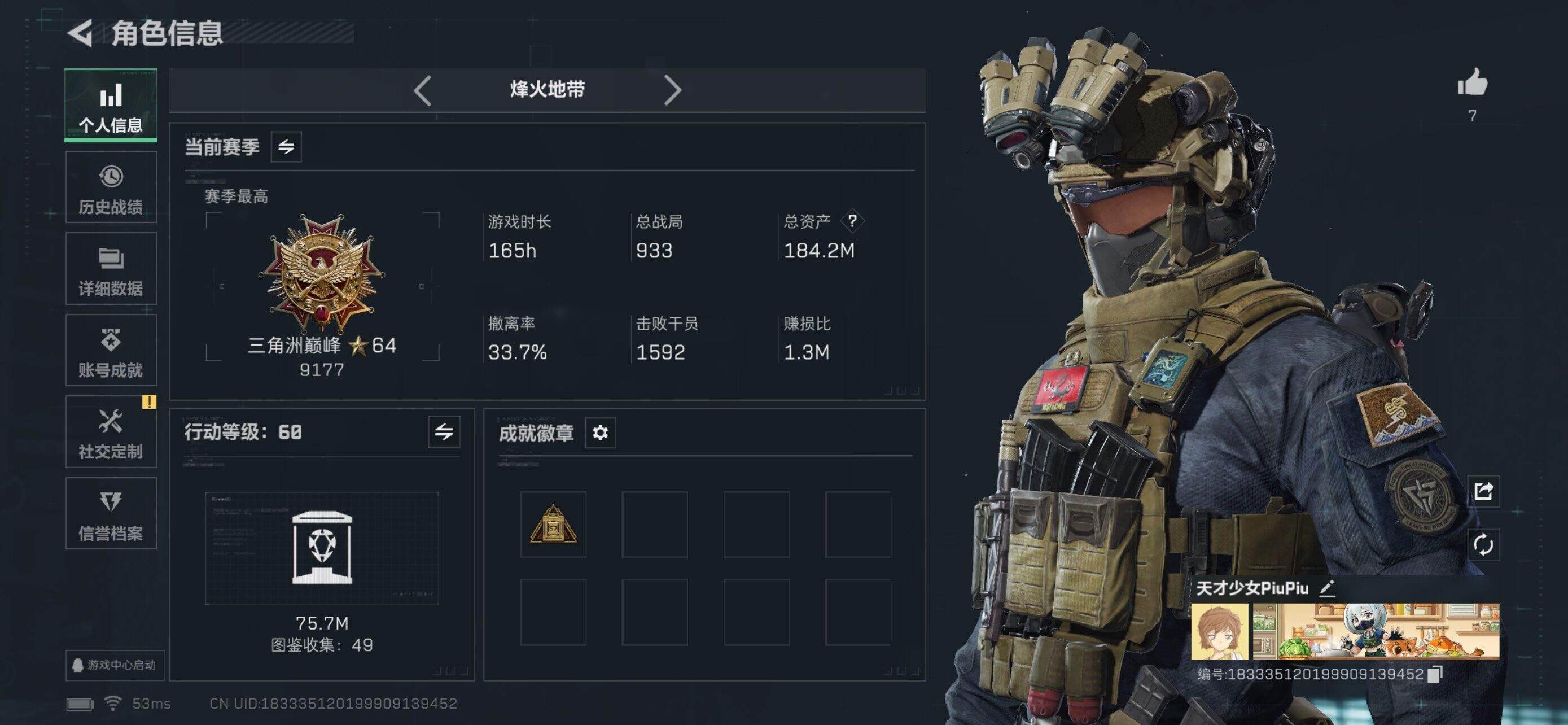 [16335811]【特价出售/店主推荐】 184m总资产-3277k哈伏币-60烽火等级-三角洲巅峰-9战场等级-列兵