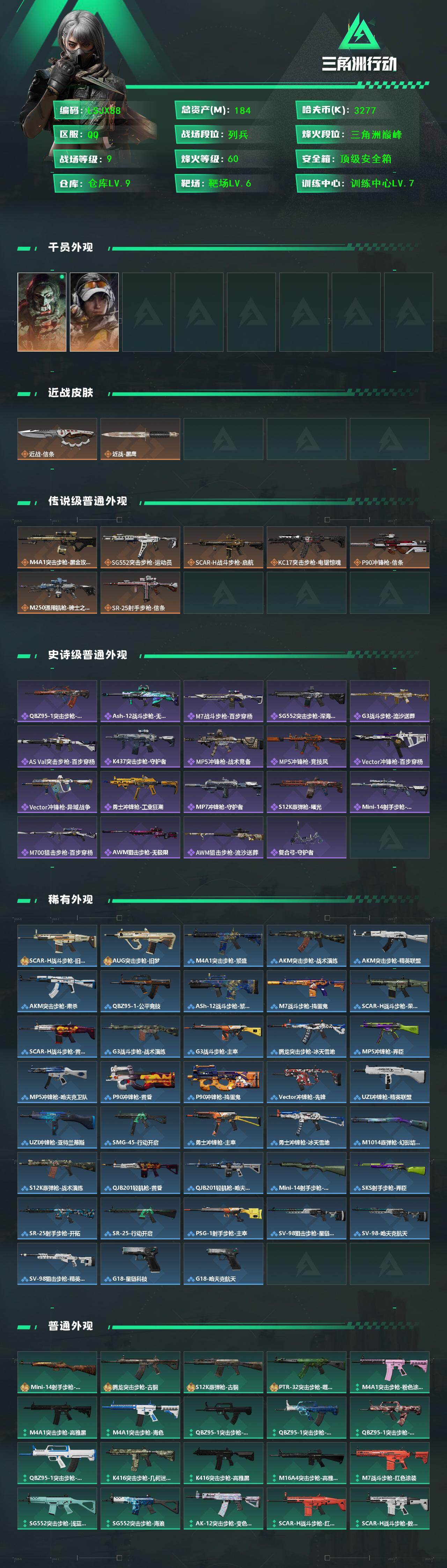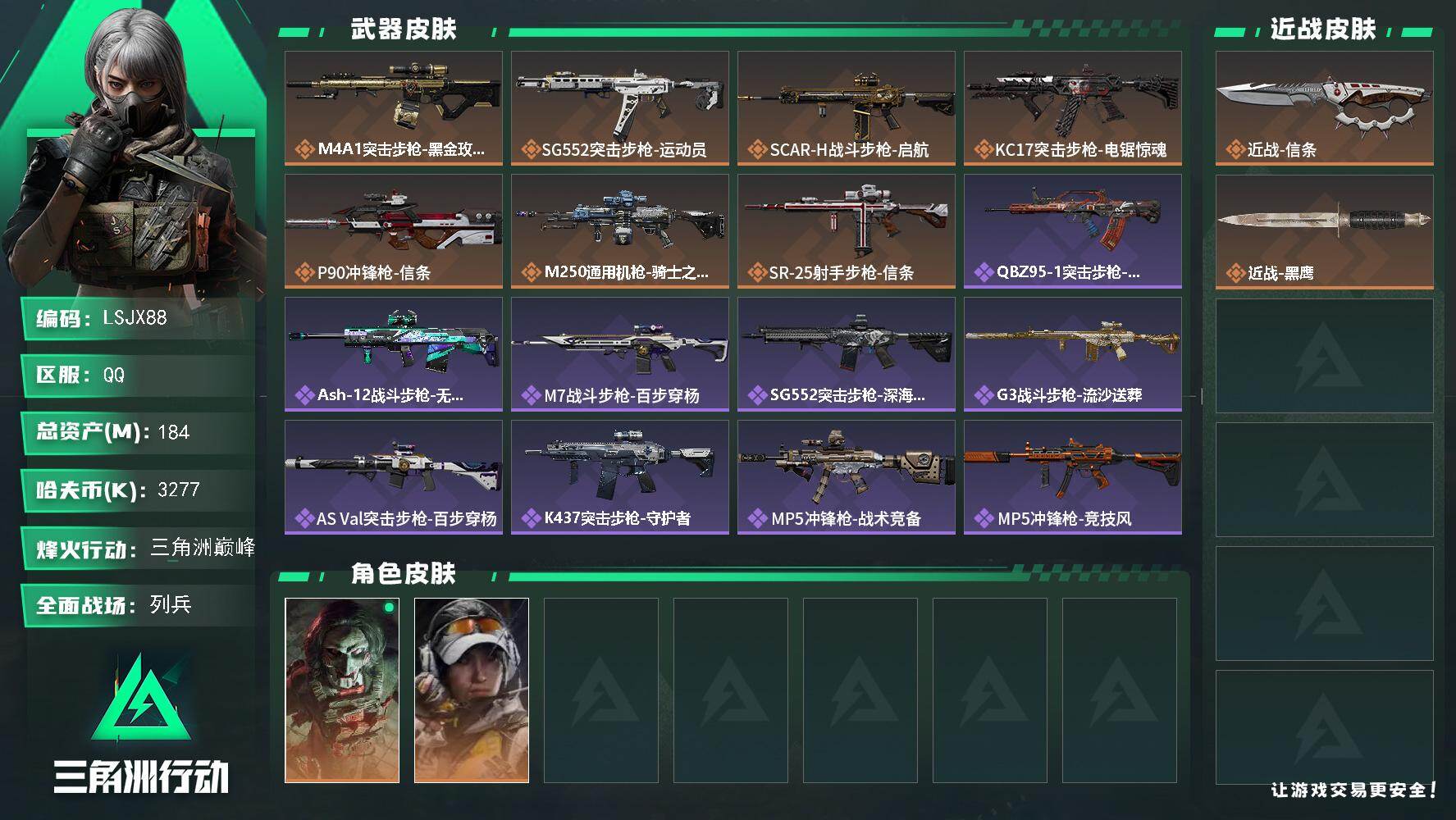 [16335811]【特价出售/店主推荐】 184m总资产-3277k哈伏币-60烽火等级-三角洲巅峰-9战场等级-列兵 【干员外观】:红狼-电锯惊魂,露娜-金牌射手 【近战皮肤】:近战-信条,近战-黑鹰 【传说外观】:M4A1突击步枪-蚀金玫瑰,SG552突击步枪-运动员,SCAR-H战斗步枪-启航,KC17突击步枪-电锯惊魂,P90冲锋枪-信条,M250通用机枪-骑士之心,SR-25射手步枪-信条 【史诗外观】:QBZ95-1突击步枪-曙光,ASh-12战斗步枪-无极限,M7战斗步枪-百步穿杨,SG552突击步枪-深海恐惧,G3战斗步枪-流沙送葬,AS Val突击步枪-百步穿杨,K437突击步枪-守护者,MP5冲锋枪-战术竞备,MP5冲锋枪-竞技风,Vector冲锋枪-百步穿杨,Vector冲锋枪-异域战争,勇士冲锋枪-工业狂潮,MP7冲锋枪-守护者,S12K霰弹枪-曙光,Mini-14射手步枪-守护者,M700狙击步枪-百步穿杨,AWM狙击步枪-无极限,AWM狙击步枪-流沙送葬,复合弓-守护者 【稀有外观】:SCAR-H战斗步枪-旧梦,AUG突击步枪-旧梦,M4A1突击步枪-繁盛,AKM突击步枪-战术演练,AKM突击步枪-精英联盟,AKM突击步枪-肃杀,QBZ95-1突击步枪-公平竞技,ASh-12战斗步枪-繁盛,M7战斗步枪-捣蛋鬼,SCAR-H战斗步枪-荣耀列队,SCAR-H战斗步枪-黄昏,G3战斗步枪-战术演练,G3战斗步枪-主宰,腾龙突击步枪-冰天雪地,MP5冲锋枪-弄臣,MP5冲锋枪-哈夫克卫队,P90冲锋枪-黄昏,P90冲锋枪-捣蛋鬼,Vector冲锋枪-先锋,UZI冲锋枪-精英联盟,UZI冲锋枪-亚特兰蒂斯,SMG-45-行动开启,勇士冲锋枪-主宰,勇士冲锋枪-冰天雪地,M1014霰弹枪-幻影结构,S12K霰弹枪-战术演练,QJB201轻机枪-黄昏,QJB201轻机枪-哈夫克卫队,Mini-14射手步枪-荣耀列队,SKS射手步枪-弄臣,SR-25射手步枪-开拓,SR-25-行动开启,PSG-1射手步枪-主宰,SV-98狙击步枪-星链科技,SV-98狙击步枪-哈夫克航天,SV-98狙击步枪-精英联盟,G18-星链科技,G18-哈夫克航天 【普通外观】:Mini-14射手步枪-黄铜,腾龙突击步枪-古铜,S12K霰弹枪-古铜,PTR-32突击步枪-噬菌体,M4A1突击步