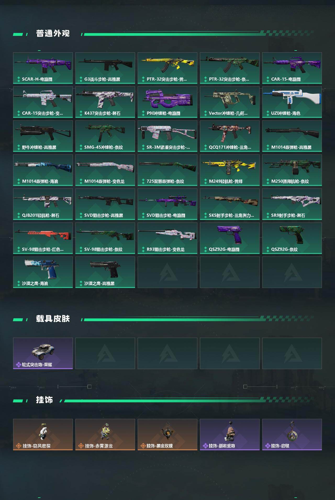 【稀有外观】:SCAR-H战斗步枪-旧梦,AUG突击步枪-旧梦,M4A1突击步枪-繁盛,AKM突击步枪-战术演练,AKM突击步枪-精英联盟,AKM突击步枪-肃杀,QBZ95-1突击步枪-公平竞技,ASh-12战斗步枪-繁盛,M7战斗步枪-捣蛋鬼,SCAR-H战斗步枪-荣耀列队,SCAR-H战斗步枪-黄昏,G3战斗步枪-战术演练,G3战斗步枪-主宰,腾龙突击步枪-冰天雪地,MP5冲锋枪-弄臣,MP5冲锋枪-哈夫克卫队,P90冲锋枪-黄昏,P90冲锋枪-捣蛋鬼,Vector冲锋枪-先锋,UZI冲锋枪-精英联盟,UZI冲锋枪-亚特兰蒂斯,SMG-45-行动开启,勇士冲锋枪-主宰,勇士冲锋枪-冰天雪地,M1014霰弹枪-幻影结构,S12K霰弹枪-战术演练,QJB201轻机枪-黄昏,QJB201轻机枪-哈夫克卫队,Mini-14射手步枪-荣耀列队,SKS射手步枪-弄臣,SR-25射手步枪-开拓,SR-25-行动开启,PSG-1射手步枪-主宰,SV-98狙击步枪-星链科技,SV-98狙击步枪-哈夫克航天,SV-98狙击步枪-精英联盟,G18-星链科技,G18-哈夫克航天