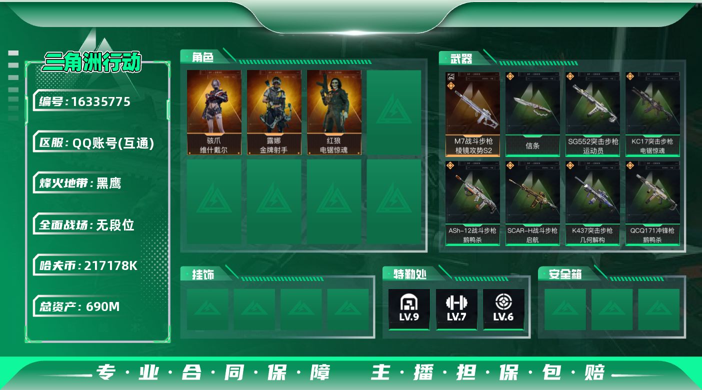 [16335775]1典藏枪皮M7优品炫彩【特价出售/店主推荐】690m总资产-217178k哈伏币-60烽火等级-黑鹰-1战场等级-无军衔 【干员外观】:骇爪-维什戴尔,红狼-电锯惊魂,露娜-金牌射手 【近战皮肤】:近战-信条,近战-黑鹰 【典藏外观】:M7战斗步枪-棱镜攻势S2 【传说外观】:ASh-12战斗步枪-鹅鸭杀,M16A4突击步枪-狩猎时刻,SG552突击步枪-运动员,SCAR-H战斗步枪-启航,G3战斗步枪-狩猎时刻,CAR-15突击步枪-阿米娅,K437突击步枪-几何解构,KC17突击步枪-电锯惊魂,Vector冲锋枪-狩猎时刻,勇士冲锋枪-能天使-午夜邮差,QCQ171冲锋枪-鹅鸭杀,M250通用机枪-几何解构,QJB201轻机枪-鹅鸭杀,SR-9射手步枪-几何解构,R93狙击步枪-维什戴尔 【史诗外观】:QBZ95-1突击步枪-曙光,M7战斗步枪-百步穿杨,G3战斗步枪-流沙送葬,AS Val突击步枪-百步穿杨,腾龙突击步枪-猎鳄行动,MP5冲锋枪-深海恐惧,MP5冲锋枪-战术竞备,MP5冲锋枪-竞技风,Vector冲锋枪-猎鳄行动,Vector冲锋枪-百步穿杨,Vector冲锋枪-异域战争,SR-3M紧凑突击步枪-战术竞备,勇士冲锋枪-深海恐惧,勇士冲锋枪-工业狂潮,M250通用机枪-囚徒,M14射手步枪-工业狂潮,SV-98狙击步枪-林中猎手,SV-98狙击步枪-猎鳄行动,M700狙击步枪-百步穿杨,M700狙击步枪-哈夫克警备,AWM狙击步枪-流沙送葬,沙漠之鹰-曙光 【稀有外观】:SCAR-H战斗步枪-旧梦,SR-3M紧凑突击步枪-巨兽,M4A1突击步枪-繁盛,AKM突击步枪-肃杀,QBZ95-1突击步枪-公平竞技,ASh-12战斗步枪-繁盛,M7战斗步枪-捣蛋鬼,SCAR-H战斗步枪-荣耀列队,腾龙突击步枪-冰天雪地,MP5冲锋枪-哈夫克卫队,P90冲锋枪-黄昏,Vector冲锋枪-先锋,UZI冲锋枪-亚特兰蒂斯,野牛冲锋枪-前沿科技,SMG-45冲锋枪-前沿科技,SMG-45-行动开启,勇士冲锋枪-主宰,勇士冲锋枪-冰天雪地,MP7冲锋枪-钢铁之躯,M1014霰弹枪-幻影结构,M249轻机枪-毛鲁斯之力,Mini-14射手步枪-荣耀列队,SKS射手步枪-弄臣,PSG-1射手步枪-主宰,SV-98狙击步枪-星链科技,SV-98狙击步枪-哈夫克航天,SV