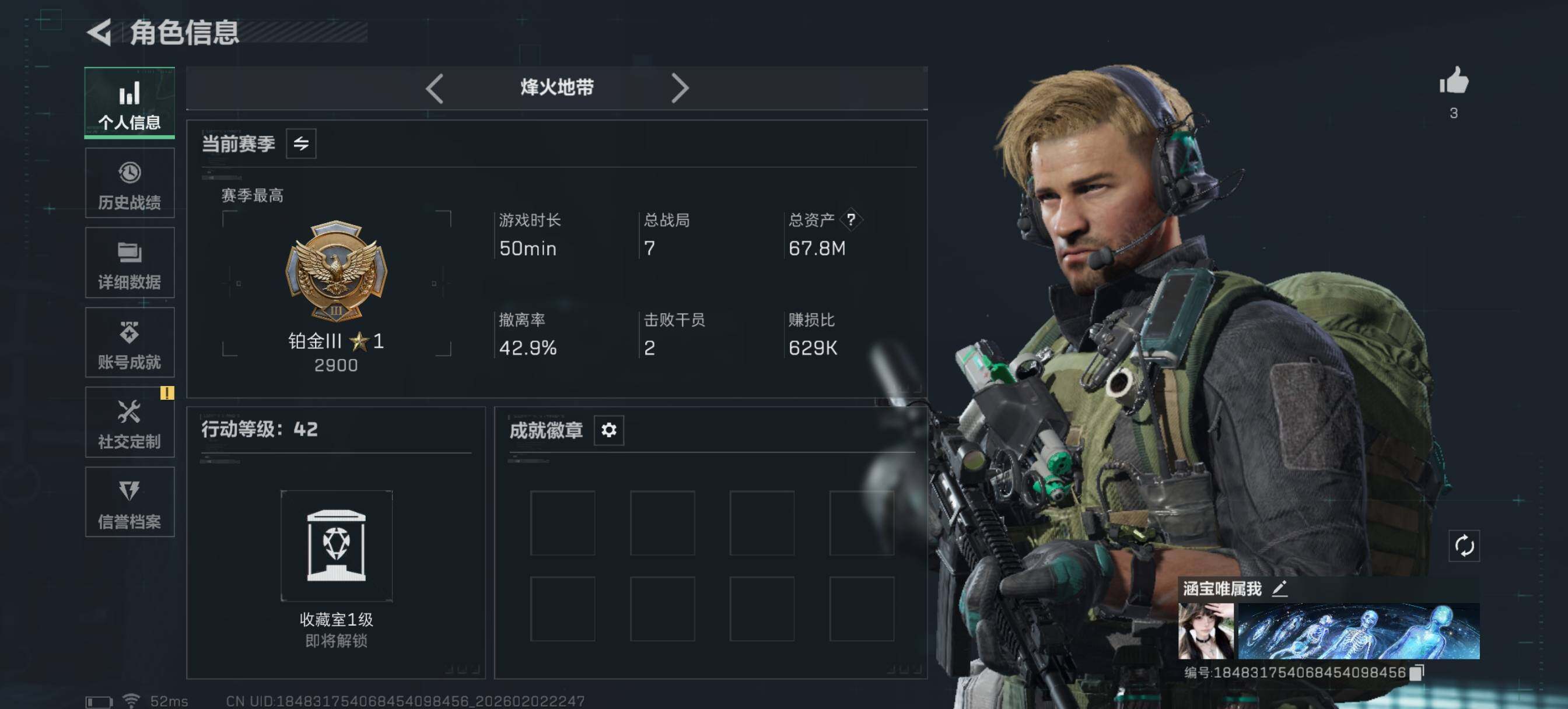 [16337272]【特价出售/店主推荐】67m总资产-10909k哈伏币-42烽火等级-铂金-1战场等级-无军衔