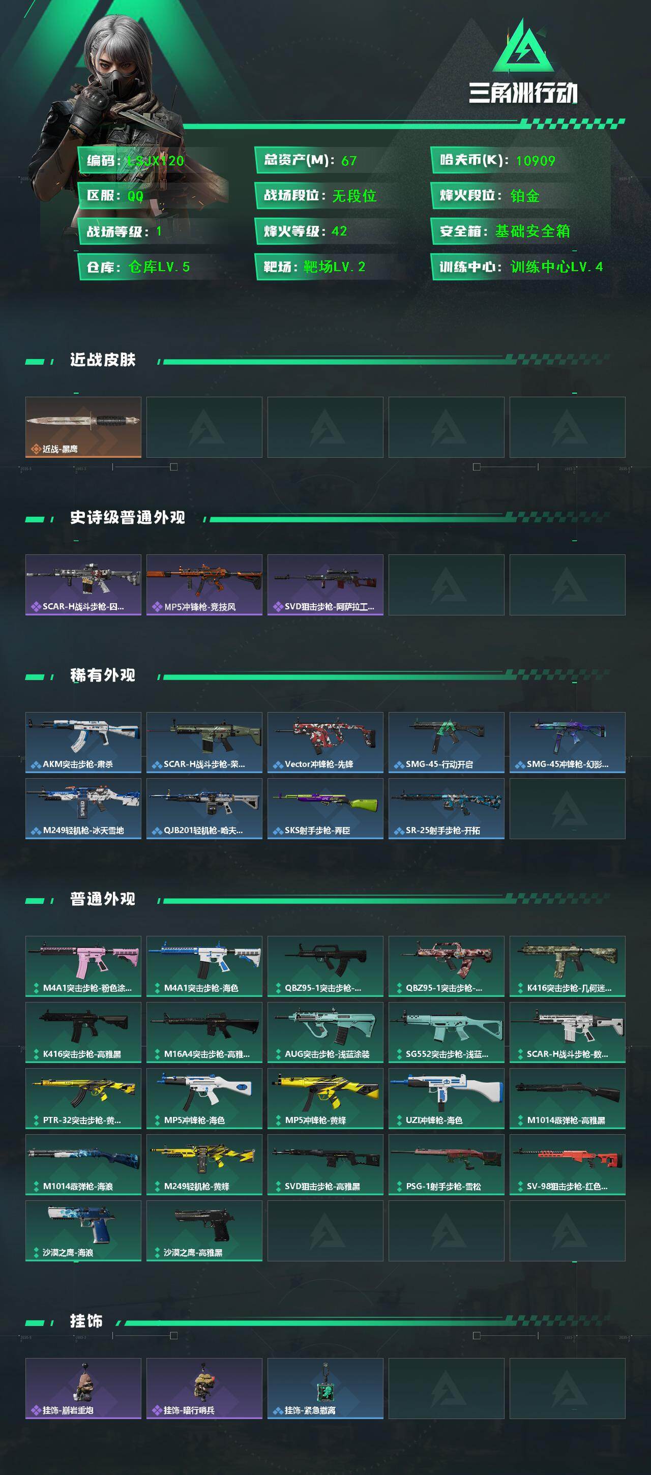 [16337272]【特价出售/店主推荐】67m总资产-10909k哈伏币-42烽火等级-铂金-1战场等级-无军衔 【近战皮肤】:近战-黑鹰 【史诗外观】:SCAR-H战斗步枪-囚徒,MP5冲锋枪-竞技风,SVD狙击步枪-阿萨拉工艺 【稀有外观】:AKM突击步枪-肃杀,SCAR-H战斗步枪-荣耀列队,Vector冲锋枪-先锋,SMG-45-行动开启,SMG-45冲锋枪-幻影结构,M249轻机枪-冰天雪地,QJB201轻机枪-哈夫克卫队,SKS射手步枪-弄臣,SR-25射手步枪-开拓 【普通外观】:M4A1突击步枪-粉色涂装,M4A1突击步枪-海色,QBZ95-1突击步枪-高雅黑,QBZ95-1突击步枪-三角洲力量,QBZ95-1突击步枪-2026,K416突击步枪-几何迷彩,K416突击步枪-高雅黑,M16A4突击步枪-高雅黑,AUG突击步枪-浅蓝涂装,SG552突击步枪-浅蓝涂装,SCAR-H战斗步枪-数码迷彩,PTR-32突击步枪-黄蜂,MP5冲锋枪-海色,MP5冲锋枪-黄蜂,UZI冲锋枪-海色,M1014霰弹枪-高雅黑,M1014霰弹枪-海浪,M249轻机枪-黄蜂,SVD狙击步枪-高雅黑,PSG-1射手步枪-雪松,SV-98狙击步枪-红色涂装,沙漠之鹰-海浪,沙漠之鹰-高雅黑 【挂饰】:挂饰-崩岩重炮,挂饰-暗行哨兵*2,挂饰-紧急撤离*10