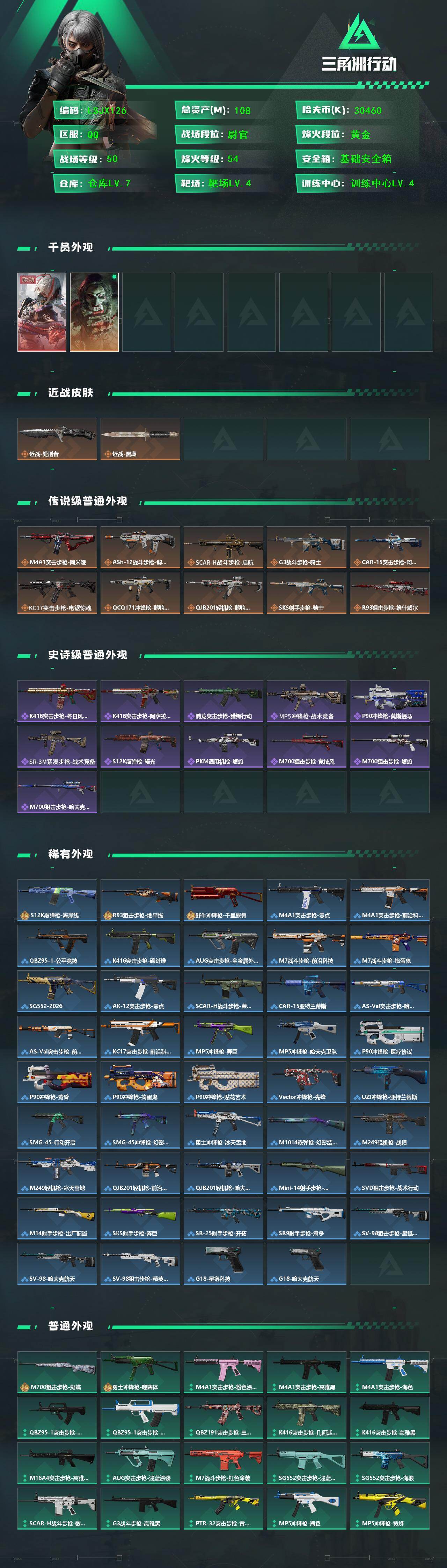 [16363602]【特价出售/店主推荐】108m总资产-30460k哈伏币-54烽火等级-黄金-50战场等级-尉官 【干员外观】:骇爪-维什戴尔,红狼-电锯惊魂 【近战皮肤】:近战-处刑者,近战-黑鹰 【传说外观】:M4A1突击步枪-阿米娅,ASh-12战斗步枪-鹅鸭杀,SCAR-H战斗步枪-启航,G3战斗步枪-骑士,CAR-15突击步枪-阿米娅,KC17突击步枪-电锯惊魂,QCQ171冲锋枪-鹅鸭杀,QJB201轻机枪-鹅鸭杀,SKS射手步枪-骑士,R93狙击步枪-维什戴尔 【史诗外观】:K416突击步枪-冬日风情,K416突击步枪-阿萨拉特攻,腾龙突击步枪-猎鳄行动,MP5冲锋枪-战术竞备,P90冲锋枪-莫斯提马,SR-3M紧凑突击步枪-战术竞备,S12K霰弹枪-曙光,PKM通用机枪-蝮蛇,M700狙击步枪-竞技风,M700狙击步枪-蝮蛇,M700狙击步枪-哈夫克警备 【稀有外观】:S12K霰弹枪-海岸线,R93狙击步枪-地平线,野牛冲锋枪-千里骏骨,M4A1突击步枪-零点,M4A1突击步枪-前沿科技,QBZ95-1突击步枪-公平竞技,K416突击步枪-碳纤维,AUG突击步枪-全金属外壳,M7战斗步枪-前沿科技,M7战斗步枪-捣蛋鬼,SG552突击步枪-2026,AK-12突击步枪-零点,SCAR-H战斗步枪-荣耀列队,CAR-15突击步枪-亚特兰蒂斯,AS Val突击步枪-哈夫克科技,AS Val突击步枪-前沿科技,KC17突击步枪-前沿科技,MP5冲锋枪-弄臣,MP5冲锋枪-哈夫克卫队,P90冲锋枪-医疗协议,P90冲锋枪-黄昏,P90冲锋枪-捣蛋鬼,P90冲锋枪-贴花艺术,Vector冲锋枪-先锋,UZI冲锋枪-亚特兰蒂斯,SMG-45-行动开启,SMG-45冲锋枪-幻影结构,勇士冲锋枪-冰天雪地,M1014霰弹枪-幻影结构,M249轻机枪-战损,M249轻机枪-冰天雪地,QJB201轻机枪-前沿科技,QJB201轻机枪-哈夫克卫队,Mini-14射手步枪-荣耀列队,SVD狙击步枪-战术行动,M14射手步枪-出厂配置,SKS射手步枪-弄臣,SR-25射手步枪-开拓,SR9射手步枪-肃杀,SV-98狙击步枪-星链科技,SV-98狙击步枪-哈夫克航天,SV-98狙击步枪-精英联盟,G18-星链科技,G18-哈夫克航天 【普通外观】:M700狙击步枪-蝴蝶,勇士冲锋枪-噬菌体,