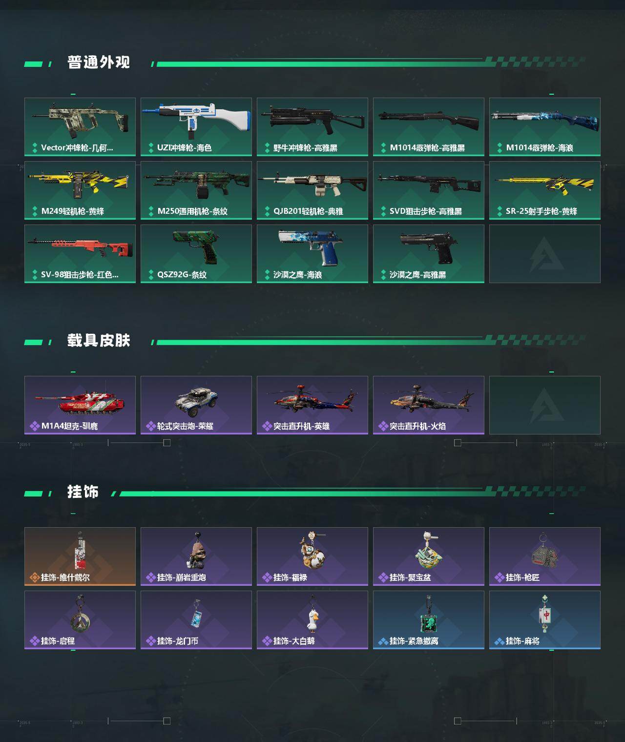 【稀有外观】:S12K霰弹枪-海岸线,R93狙击步枪-地平线,野牛冲锋枪-千里骏骨,M4A1突击步枪-零点,M4A1突击步枪-前沿科技,QBZ95-1突击步枪-公平竞技,K416突击步枪-碳纤维,AUG突击步枪-全金属外壳,M7战斗步枪-前沿科技,M7战斗步枪-捣蛋鬼,SG552突击步枪-2026,AK-12突击步枪-零点,SCAR-H战斗步枪-荣耀列队,CAR-15突击步枪-亚特兰蒂斯,AS Val突击步枪-哈夫克科技,AS Val突击步枪-前沿科技,KC17突击步枪-前沿科技,MP5冲锋枪-弄臣,MP5冲锋枪-哈夫克卫队,P90冲锋枪-医疗协议,P90冲锋枪-黄昏,P90冲锋枪-捣蛋鬼,P90冲锋枪-贴花艺术,Vector冲锋枪-先锋,UZI冲锋枪-亚特兰蒂斯,SMG-45-行动开启,SMG-45冲锋枪-幻影结构,勇士冲锋枪-冰天雪地,M1014霰弹枪-幻影结构,M249轻机枪-战损,M249轻机枪-冰天雪地,QJB201轻机枪-前沿科技,QJB201轻机枪-哈夫克卫队,Mini-14射手步枪-荣耀列队,SVD狙击步枪-战术行动,M14射手步枪-出厂配置,SKS射手步枪-弄臣,SR-25射手步枪-开拓,SR9射手步枪-肃杀,SV-98狙击步枪-星链科技,SV-98狙击步枪-哈夫克航天,SV-98狙击步枪-精英联盟,G18-星链科技,G18-哈夫克航天