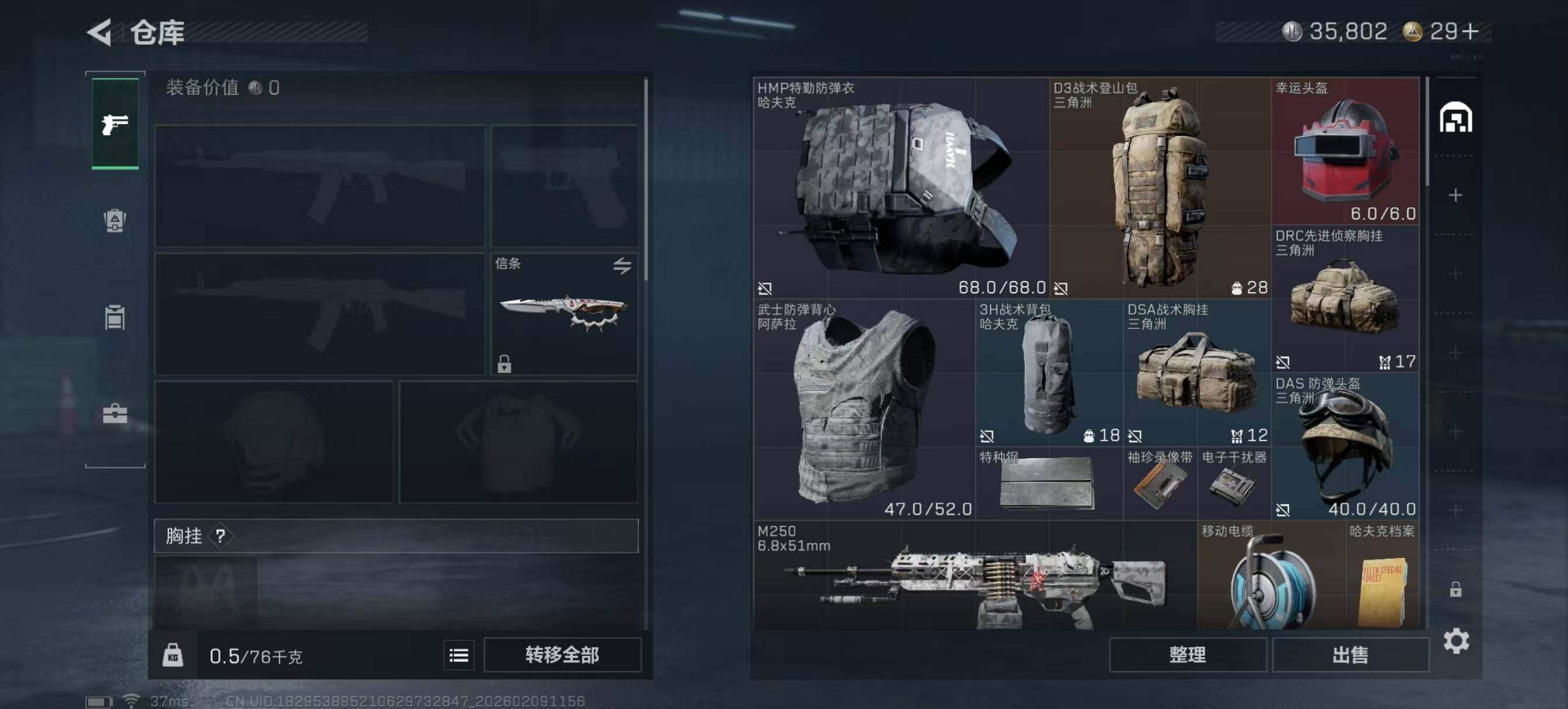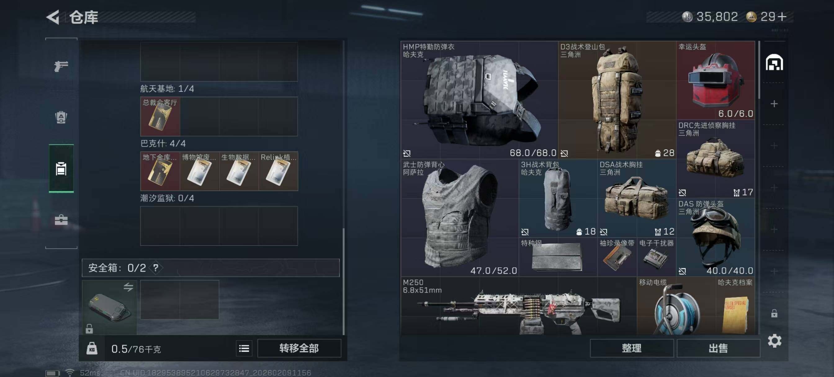 - [12084777]总资产:205.7M 2干员外观 5传说枪械 哈夫币:126K 顶级安全箱(9.17到期) 可二次 可修改实名 优质装备:顶级安全箱(3x3),非洲之心 烽火地带段位:黑鹰 全面战场段位:上等兵 传说武器皮肤:AK-12突击步枪-夜鹰,SMG45冲锋枪-骑士,复合弓-黑-天际线,勇士冲锋枪-能天使-午夜邮差,CAR-15突击步枪-黑鹰坠落 史诗武器皮肤:PKM通用机枪-蝮蛇,G3战斗步枪-战场英杰,SR-25射手步枪-尖端治疗,AS Val突击步枪-尖端治疗,SG552突击步枪-尖端治疗,Ash-12战斗步枪-守夜人,MP5冲锋枪-深海恐惧,勇士冲锋枪-深海恐惧,AKM突击步枪-林中猎手,.357左轮-幸运时刻,SVD狙击步枪-暗夜猎手,M16A4突击步枪-竞赛选手,PKM通用机枪-守夜人,M1014霰弹枪-林中猎手,SV-98狙击步枪-林中猎手,M250通用机枪-囚徒,SV-98狙击步枪-囚徒,QBZ95-1突击步枪-曙光,Vector冲锋枪-阿萨拉文明,SVD狙击步枪-阿萨拉工艺,S12K霰弹枪-曙光,PKM通用机枪-英雄,M700狙击步枪-竞技风 干员外观:无名-夜鹰,露娜-黑·天际线