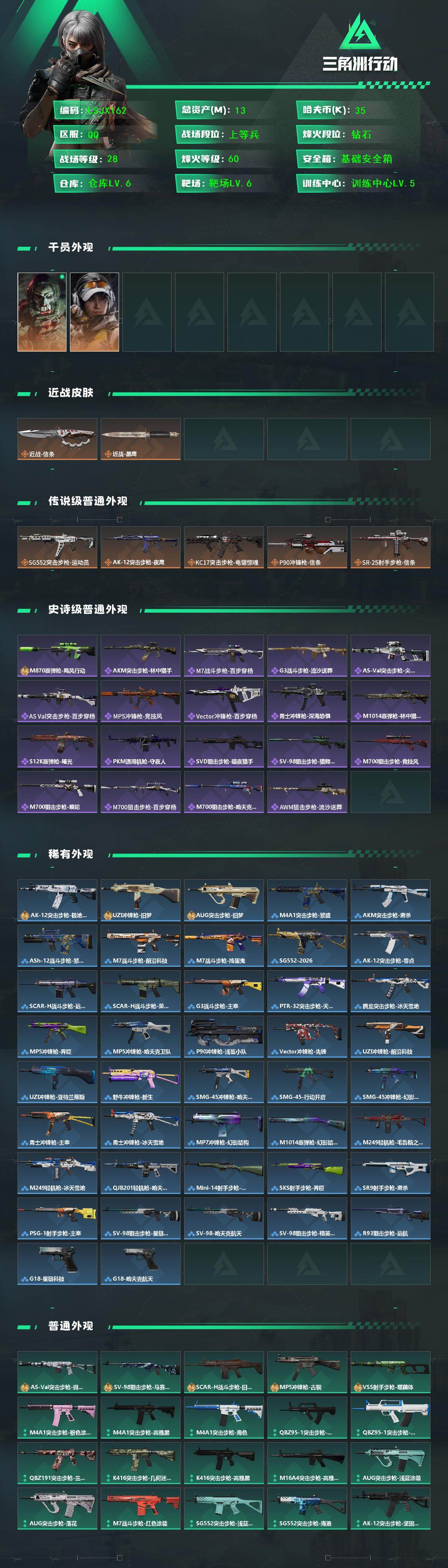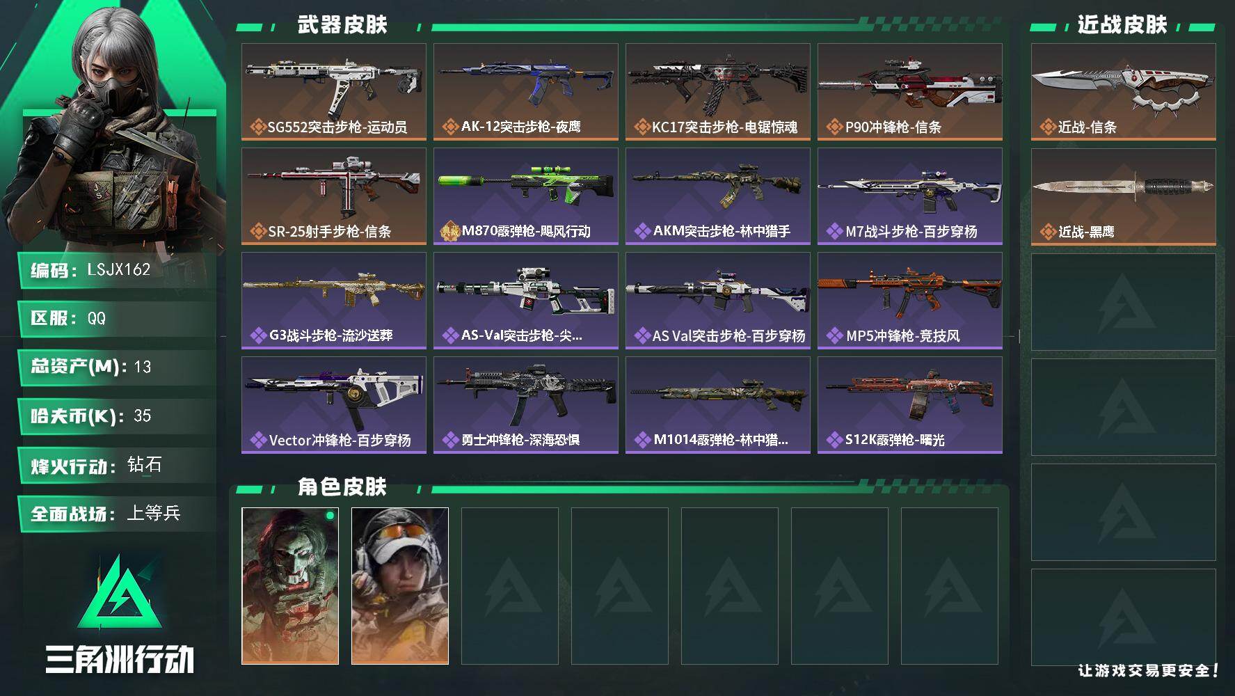 [16607714]【店主推荐捡漏号!可直接换绑】13m总资产-35k哈伏币-60烽火等级-钻石-28战场等级-上等兵 【干员外观】:红狼-电锯惊魂,露娜-金牌射手 【近战皮肤】:近战-信条,近战-黑鹰 【传说外观】:SG552突击步枪-运动员,AK-12突击步枪-夜鹰,KC17突击步枪-电锯惊魂,P90冲锋枪-信条,SR-25射手步枪-信条 【史诗外观】:M870霰弹枪-飓风行动,AKM突击步枪-林中猎手,M7战斗步枪-百步穿杨,G3战斗步枪-流沙送葬,AS Val突击步枪-尖端治疗,AS Val突击步枪-百步穿杨,MP5冲锋枪-竞技风,Vector冲锋枪-百步穿杨,勇士冲锋枪-深海恐惧,M1014霰弹枪-林中猎手,S12K霰弹枪-曙光,PKM通用机枪-守夜人,SVD狙击步枪-暗夜猎手,SV-98狙击步枪-猎鳄行动,M700狙击步枪-竞技风,M700狙击步枪-蝮蛇,M700狙击步枪-百步穿杨,M700狙击步枪-哈夫克警备,AWM狙击步枪-流沙送葬 【稀有外观】:AK-12突击步枪-极地勘察队,UZI冲锋枪-旧梦,AUG突击步枪-旧梦,M4A1突击步枪-繁盛,AKM突击步枪-肃杀,ASh-12战斗步枪-繁盛,M7战斗步枪-前沿科技,M7战斗步枪-捣蛋鬼,SG552突击步枪-2026,AK-12突击步枪-零点,SCAR-H战斗步枪-远航,SCAR-H战斗步枪-荣耀列队,G3战斗步枪-主宰,PTR-32突击步枪-天网,腾龙突击步枪-冰天雪地,MP5冲锋枪-弄臣,MP5冲锋枪-哈夫克卫队,P90冲锋枪-浅鲨小队,Vector冲锋枪-先锋,UZI冲锋枪-前沿科技,UZI冲锋枪-亚特兰蒂斯,野牛冲锋枪-新生,SMG-45冲锋枪-哈夫克卫队,SMG-45-行动开启,SMG-45冲锋枪-幻影结构,勇士冲锋枪-主宰,勇士冲锋枪-冰天雪地,MP7冲锋枪-幻影结构,M1014霰弹枪-幻影结构,M249轻机枪-毛鲁斯之力,M249轻机枪-冰天雪地,QJB201轻机枪-哈夫克卫队,Mini-14射手步枪-荣耀列队,SKS射手步枪-弄臣,SR9射手步枪-肃杀,PSG-1射手步枪-主宰,SV-98狙击步枪-星链科技,SV-98狙击步枪-哈夫克航天,SV-98狙击步枪-精英联盟,R93狙击步枪-远航,G18-星链科技,G18-哈夫克航天 【普通外观】:AS Val突击步枪-蝴蝶,SV-98狙击步枪-马赛克涂装,S