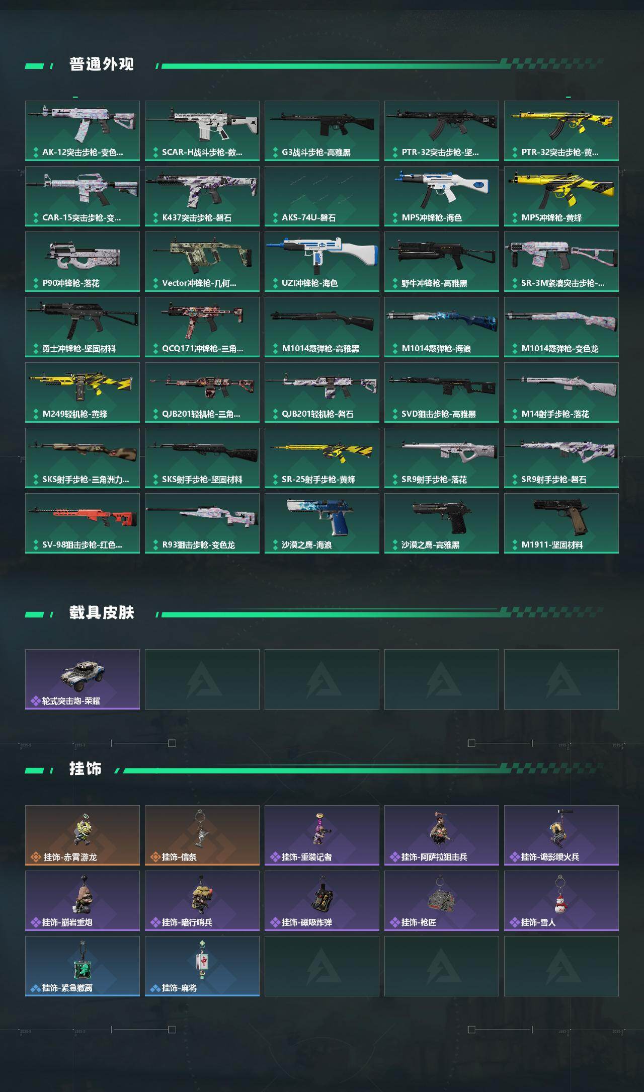 【稀有外观】:AK-12突击步枪-极地勘察队,UZI冲锋枪-旧梦,AUG突击步枪-旧梦,M4A1突击步枪-繁盛,AKM突击步枪-肃杀,ASh-12战斗步枪-繁盛,M7战斗步枪-前沿科技,M7战斗步枪-捣蛋鬼,SG552突击步枪-2026,AK-12突击步枪-零点,SCAR-H战斗步枪-远航,SCAR-H战斗步枪-荣耀列队,G3战斗步枪-主宰,PTR-32突击步枪-天网,腾龙突击步枪-冰天雪地,MP5冲锋枪-弄臣,MP5冲锋枪-哈夫克卫队,P90冲锋枪-浅鲨小队,Vector冲锋枪-先锋,UZI冲锋枪-前沿科技,UZI冲锋枪-亚特兰蒂斯,野牛冲锋枪-新生,SMG-45冲锋枪-哈夫克卫队,SMG-45-行动开启,SMG-45冲锋枪-幻影结构,勇士冲锋枪-主宰,勇士冲锋枪-冰天雪地,MP7冲锋枪-幻影结构,M1014霰弹枪-幻影结构,M249轻机枪-毛鲁斯之力,M249轻机枪-冰天雪地,QJB201轻机枪-哈夫克卫队,Mini-14射手步枪-荣耀列队,SKS射手步枪-弄臣,SR9射手步枪-肃杀,PSG-1射手步枪-主宰,SV-98狙击步枪-星链科技,SV-98狙击步枪-哈夫克航天,SV-98狙击步枪-精英联盟,R93狙击步枪-远航,G18-星链科技,G18-哈夫克航天