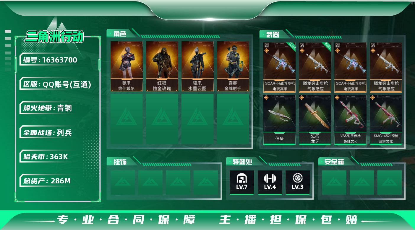 [16363700]2典藏砖皮【特价出售/店主推荐】286m总资产-363k哈伏币-60烽火等级-青铜-8战场等级-列兵 【干员外观】:红狼-蚀金玫瑰,骇爪-水墨云图,骇爪-维什戴尔,露娜-金牌射手 【近战皮肤】:近战-信条,近战-龙牙,近战-黑鹰 【典藏外观】:SCAR-H战斗步枪-电玩高手,腾龙突击步枪-气象感应 【典藏外观成色】:SCAR-H战斗步枪-电玩高手(优品A),腾龙突击步枪-气象感应(优品C) 【传说外观】:M4A1突击步枪-蚀金玫瑰,AKM突击步枪-零度协议,SG552突击步枪-运动员,AK-12突击步枪-纵横,SCAR-H战斗步枪-水墨云图,P90冲锋枪-信条,SMG-45冲锋枪-趣味文化,勇士冲锋枪-能天使-午夜邮差,MP7冲锋枪-趣味文化,M250通用机枪-纵横,SKS射手步枪-骑士,SR-25射手步枪-信条,杠杆式步枪-纵横,VSS射手步枪-趣味文化,R93狙击步枪-维什戴尔 【史诗外观】:QBZ95-1突击步枪-曙光,K416突击步枪-冬日风情,AUG突击步枪-蝮蛇,M7战斗步枪-百步穿杨,G3战斗步枪-流沙送葬,AS Val突击步枪-百步穿杨,Vector冲锋枪-百步穿杨,Vector冲锋枪-异域战争,S12K霰弹枪-曙光,SVD狙击步枪-阿萨拉工艺,M14射手步枪-工业狂潮,M700狙击步枪-百步穿杨,M700狙击步枪-哈夫克警备,AWM狙击步枪-流沙送葬 【稀有外观】:As Val突击步枪-星之彩,PKM通用机枪-黑潮,SG552突击步枪-天际线,沙漠之鹰-天际线,S12K霰弹枪-海岸线,PKM通用机枪-精湛工艺,Mini-14射手步枪-精湛工艺,SKS射手步枪-精湛工艺,R93狙击步枪-精湛工艺,R93狙击步枪-地平线,UZI冲锋枪-旧梦*2,AUG突击步枪-旧梦,SR-3M紧凑突击步枪-巨兽*3,M14射手步枪-巨兽*3,K437突击步枪-巨兽*2,M4A1突击步枪-繁盛,ASh-12战斗步枪-繁盛,SG552突击步枪-2026,SCAR-H战斗步枪-荣耀列队,G3战斗步枪-主宰,PTR-32突击步枪-天网,MP5冲锋枪-哈夫克卫队,UZI冲锋枪-亚特兰蒂斯,SMG-45-行动开启,勇士冲锋枪-主宰,勇士冲锋枪-冰天雪地,MP7冲锋枪-钢铁之躯,M1014霰弹枪-幻影结构,M249轻机枪-毛鲁斯之力,M249轻机枪-冰天雪地,QJB201轻机枪-