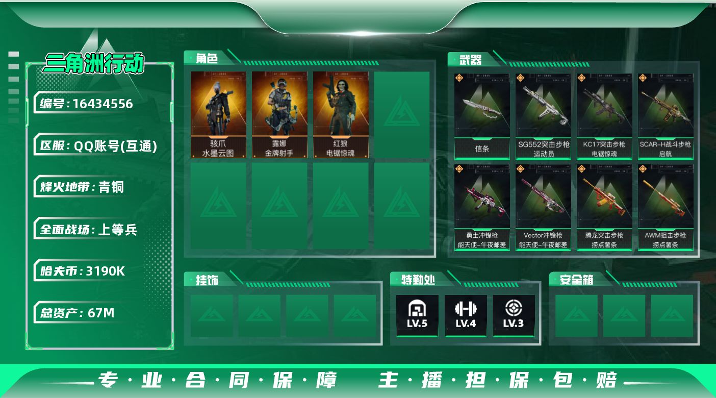 [16434556]【特价出售/店主推荐】67m总资产-3190k哈伏币-60烽火等级-青铜-28战场等级-上等兵 【干员外观】:骇爪-水墨云图,红狼-电锯惊魂,露娜-金牌射手 【近战皮肤】:近战-信条,近战-黑鹰 【传说外观】:SG552突击步枪-运动员,SCAR-H战斗步枪-水墨云图,SCAR-H战斗步枪-启航,腾龙突击步枪-捞点薯条,KC17突击步枪-电锯惊魂,Vector冲锋枪-能天使-午夜邮差,勇士冲锋枪-能天使-午夜邮差,AWM狙击步枪-捞点薯条,93R-捞点薯条 【史诗外观】:AKM突击步枪-林中猎手,QBZ95-1突击步枪-曙光,K416突击步枪-冬日风情,M7战斗步枪-百步穿杨,G3战斗步枪-流沙送葬,AS Val突击步枪-百步穿杨,腾龙突击步枪-猎鳄行动,MP5冲锋枪-战术竞备,Vector冲锋枪-阿萨拉文明,Vector冲锋枪-百步穿杨,Vector冲锋枪-异域战争,M1014霰弹枪-林中猎手,S12K霰弹枪-曙光,M250通用机枪-囚徒,SV-98狙击步枪-囚徒,M700狙击步枪-竞技风,M700狙击步枪-百步穿杨,M700狙击步枪-哈夫克警备,AWM狙击步枪-流沙送葬 【稀有外观】:M4A1突击步枪-零点,M4A1突击步枪-繁盛,ASh-12战斗步枪-繁盛,K416突击步枪-碳纤维,M7战斗步枪-精英联盟,M7战斗步枪-捣蛋鬼,SG552突击步枪-2026,AK-12突击步枪-零点,SCAR-H战斗步枪-童趣,SCAR-H战斗步枪-荣耀列队,G3战斗步枪-主宰,腾龙突击步枪-冰天雪地,MP5冲锋枪-弄臣,MP5冲锋枪-哈夫克卫队,P90冲锋枪-新生,P90冲锋枪-捣蛋鬼,UZI冲锋枪-亚特兰蒂斯,SMG-45-行动开启,SMG-45冲锋枪-幻影结构,勇士冲锋枪-主宰,勇士冲锋枪-冰天雪地,MP7冲锋枪-幻影结构,M1014霰弹枪-幻影结构,M1014霰弹枪-童趣,M249轻机枪-冰天雪地,QJB201轻机枪-哈夫克卫队,Mini-14射手步枪-荣耀列队,VSS射手步枪-童趣,SVD狙击步枪-战术行动,M14射手步枪-精英联盟,SKS射手步枪-弄臣,SR-25射手步枪-开拓,SR9射手步枪-肃杀,PSG-1射手步枪-主宰,SV-98狙击步枪-星链科技,SV-98狙击步枪-哈夫克航天,SV-98狙击步枪-精英联盟,G18-星链科技,G18-哈夫克航天 【普通外观