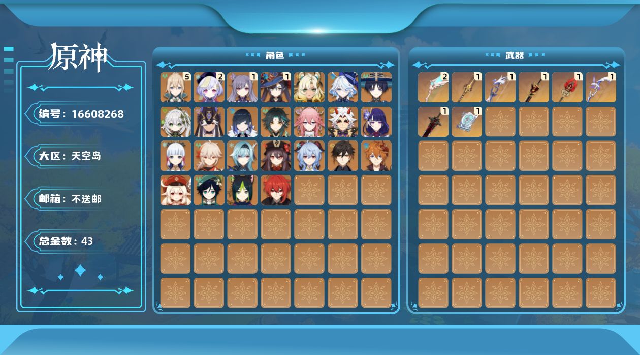 0命芙宁娜,0命流浪者,0命纳西妲,0命赛诺,0命提纳里,0命夜兰,0命八重神子,0命荒泷一斗,0命优菈,0命雷电将军,0命枫原万叶,0命神里绫华,0命钟离,0命胡桃,0命甘雨,0命魈,0命温迪,0命可莉,0命达达利亚,1命刻晴,2命七七,5命琴,1命莫娜,0命迪卢克,0命希诺宁,精1赤沙之杖,精1若水,精1赤角石溃杵,精1护摩之杖,精1四风原典,精2天空之翼,精1阿莫斯之弓,精1狼的末路