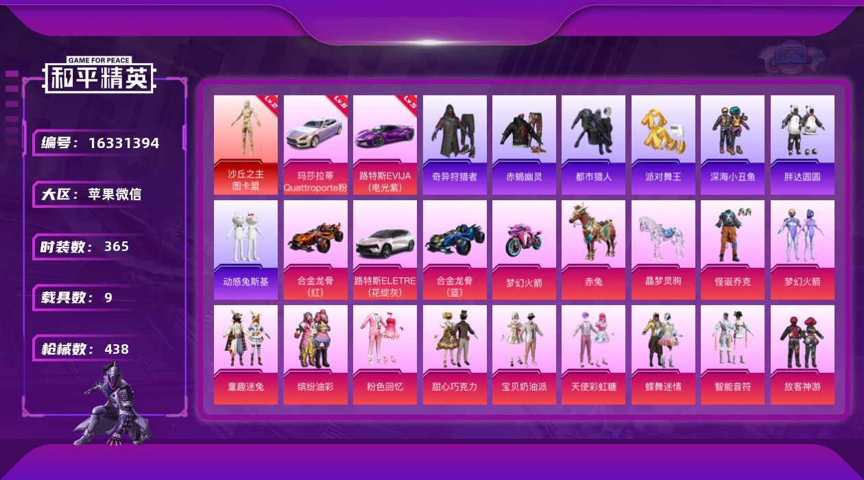 [16331394]【特价出售/店主推荐】苹果 微信-无敌战神框-1神装-51粉装-28特效枪-9载具-15粉色飞行器-193071热力值-29王牌印记-365套装-438枪皮