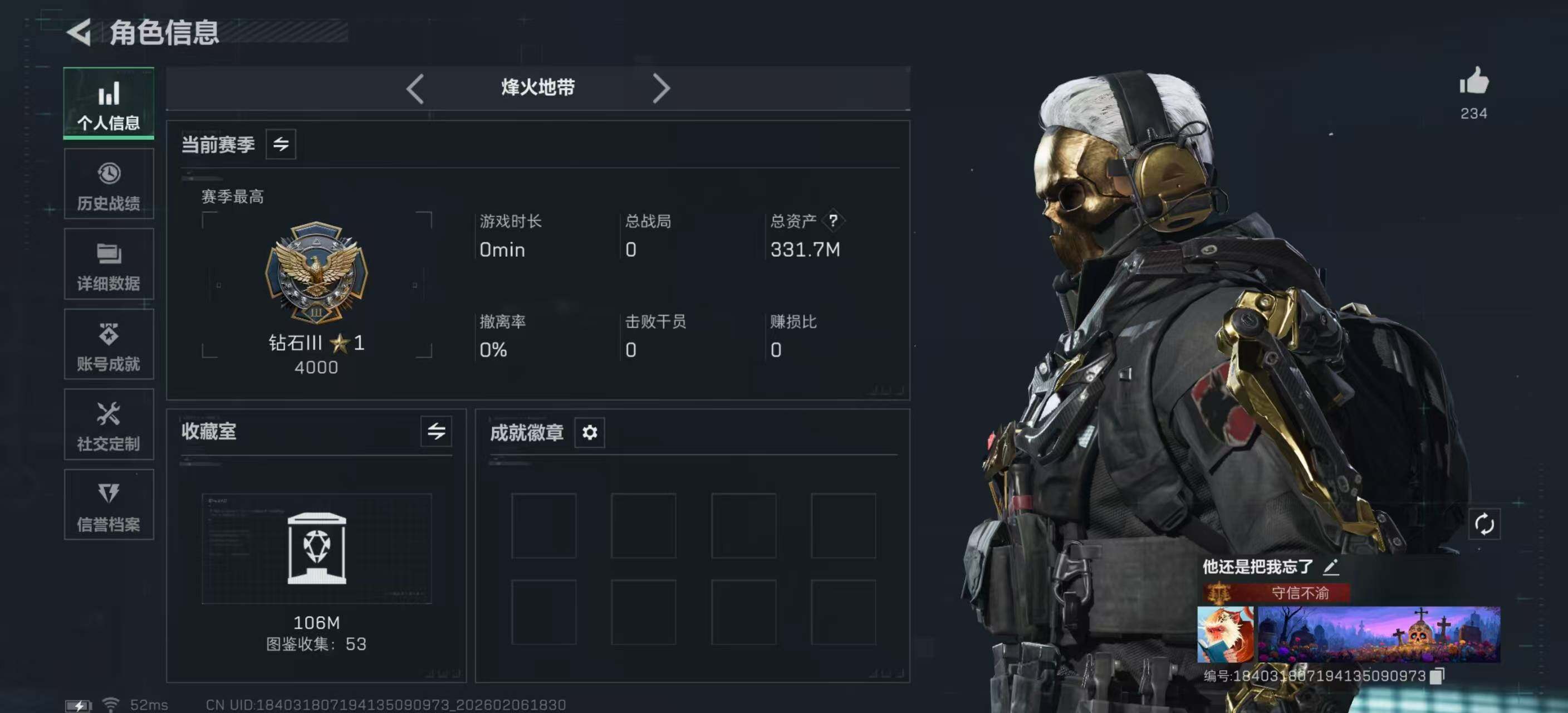 [16516423]【店主推荐捡漏号!可直接换绑】331m总资产-53744k哈伏币-60烽火等级-钻石-47战场等级-列兵
