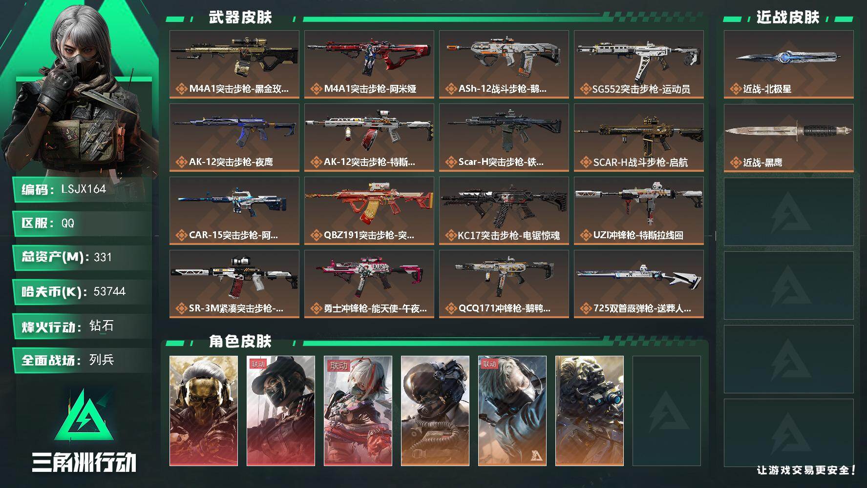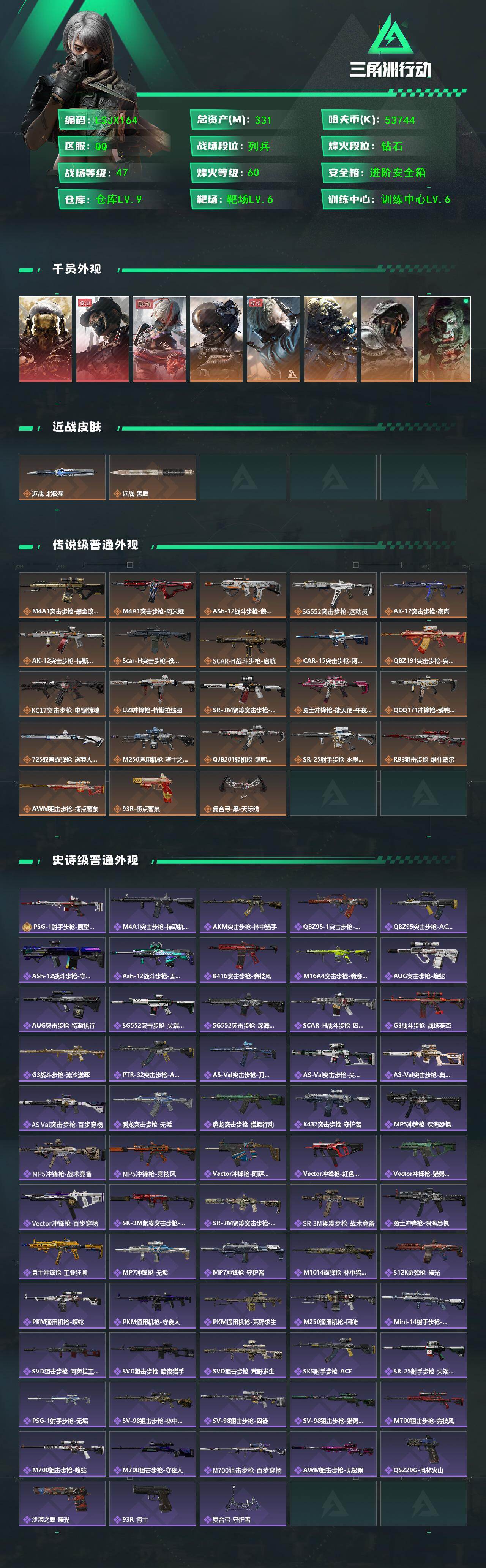 [16516423]【店主推荐捡漏号!可直接换绑】331m总资产-53744k哈伏币-60烽火等级-钻石-47战场等级-列兵 【干员外观】:红狼-蚀金玫瑰,露娜-黑·天际线,骇爪-维什戴尔,威龙-壮志凌云,蜂医-送葬人·无题密令,无名-夜鹰,深蓝-不破誓约,红狼-电锯惊魂 【近战皮肤】:近战-北极星,近战-黑鹰 【传说外观】:M4A1突击步枪-蚀金玫瑰,M4A1突击步枪-阿米娅,ASh-12战斗步枪-鹅鸭杀,SG552突击步枪-运动员,AK-12突击步枪-夜鹰,AK-12突击步枪-特斯拉线圈,SCAR-H战斗步枪-铁艺苍穹,SCAR-H战斗步枪-启航,CAR-15突击步枪-阿米娅,腾龙突击步枪-捞点薯条,KC17突击步枪-电锯惊魂,UZI冲锋枪-特斯拉线圈,SR-3M紧凑突击步枪-特斯拉线圈,勇士冲锋枪-能天使-午夜邮差,QCQ171冲锋枪-鹅鸭杀,725双管霰弹枪-送葬人-无题密令,M250通用机枪-骑士之心,QJB201轻机枪-鹅鸭杀,SR-25射手步枪-水墨云图,R93狙击步枪-维什戴尔,AWM狙击步枪-捞点薯条,93R-捞点薯条,复合弓-黑·天际线 【史诗外观】:PSG-1射手步枪-原型机,M4A1突击步枪-特勤执行,AKM突击步枪-林中猎手,QBZ95-1突击步枪-曙光,QBZ95-1突击步枪-ACE,ASh-12战斗步枪-守夜人,ASh-12战斗步枪-无极限,K416突击步枪-竞技风,M16A4突击步枪-竞赛选手,AUG突击步枪-蝮蛇,AUG突击步枪-特勤执行,SG552突击步枪-尖端治疗,SG552突击步枪-深海恐惧,SCAR-H战斗步枪-囚徒,G3战斗步枪-战场英杰,G3战斗步枪-流沙送葬,PTR-32突击步枪-ACE,AS Val突击步枪-刀锋,AS Val突击步枪-尖端治疗,AS Val突击步枪-典狱官,AS Val突击步枪-百步穿杨,腾龙突击步枪-无垢,腾龙突击步枪-猎鳄行动,K437突击步枪-守护者,MP5冲锋枪-深海恐惧,MP5冲锋枪-战术竞备,MP5冲锋枪-竞技风,Vector冲锋枪-阿萨拉文明,Vector冲锋枪-红色彗星,Vector冲锋枪-猎鳄行动,Vector冲锋枪-百步穿杨,SR-3M紧凑突击步枪-英雄,SR-3M紧凑突击步枪-荒野求生,SR-3M紧凑突击步枪-战术竞备,勇士冲锋枪-深海恐惧,勇士冲锋枪-工业狂潮,MP7冲锋枪-无垢,MP7冲锋枪