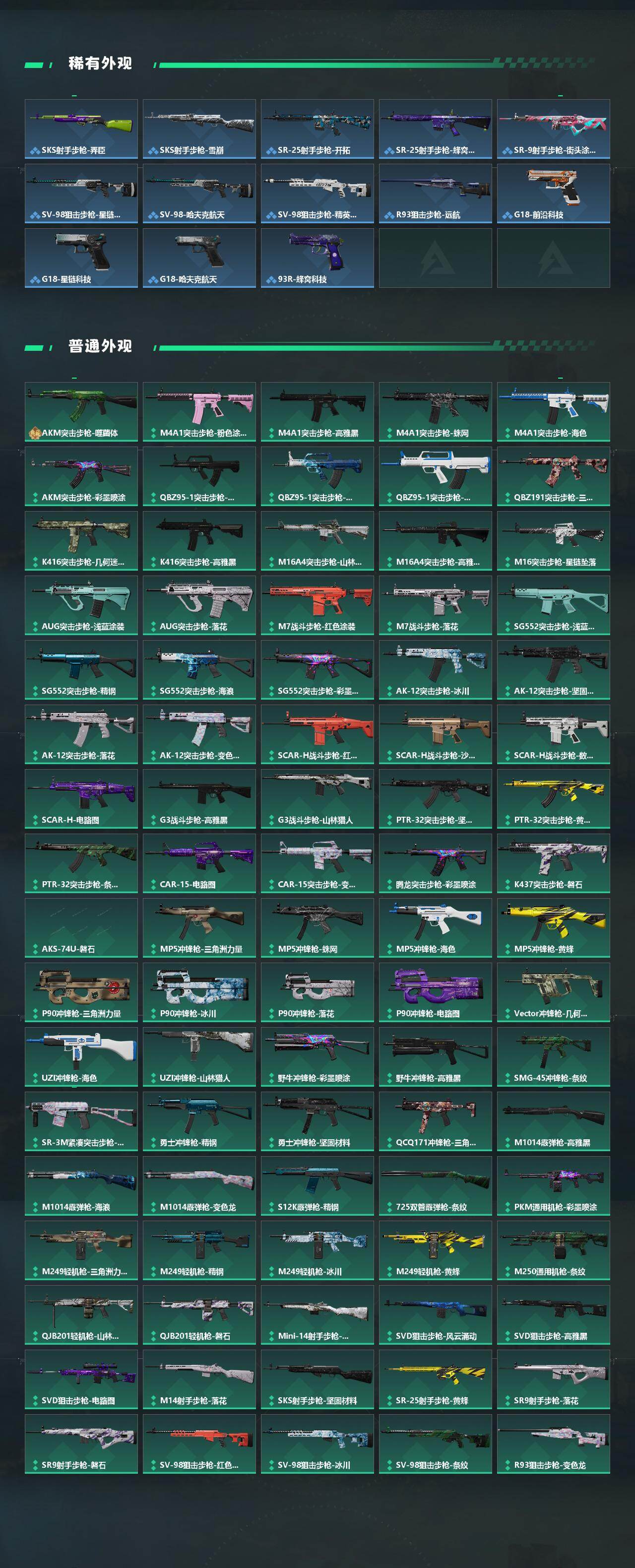 【史诗外观】:PSG-1射手步枪-原型机,M4A1突击步枪-特勤执行,AKM突击步枪-林中猎手,QBZ95-1突击步枪-曙光,QBZ95-1突击步枪-ACE,ASh-12战斗步枪-守夜人,ASh-12战斗步枪-无极限,K416突击步枪-竞技风,M16A4突击步枪-竞赛选手,AUG突击步枪-蝮蛇,AUG突击步枪-特勤执行,SG552突击步枪-尖端治疗,SG552突击步枪-深海恐惧,SCAR-H战斗步枪-囚徒,G3战斗步枪-战场英杰,G3战斗步枪-流沙送葬,PTR-32突击步枪-ACE,AS Val突击步枪-刀锋,AS Val突击步枪-尖端治疗,AS Val突击步枪-典狱官,AS Val突击步枪-百步穿杨,腾龙突击步枪-无垢,腾龙突击步枪-猎鳄行动,K437突击步枪-守护者,MP5冲锋枪-深海恐惧,MP5冲锋枪-战术竞备,MP5冲锋枪-竞技风,Vector冲锋枪-阿萨拉文明,Vector冲锋枪-红色彗星,Vector冲锋枪-猎鳄行动,Vector冲锋枪-百步穿杨,SR-3M紧凑突击步枪-英雄,SR-3M紧凑突击步枪-荒野求生,SR-3M紧凑突击步枪-战术竞备,勇士冲锋枪-深海恐惧,勇士冲锋枪-工业狂潮,MP7冲锋枪-无垢,MP7冲锋枪
