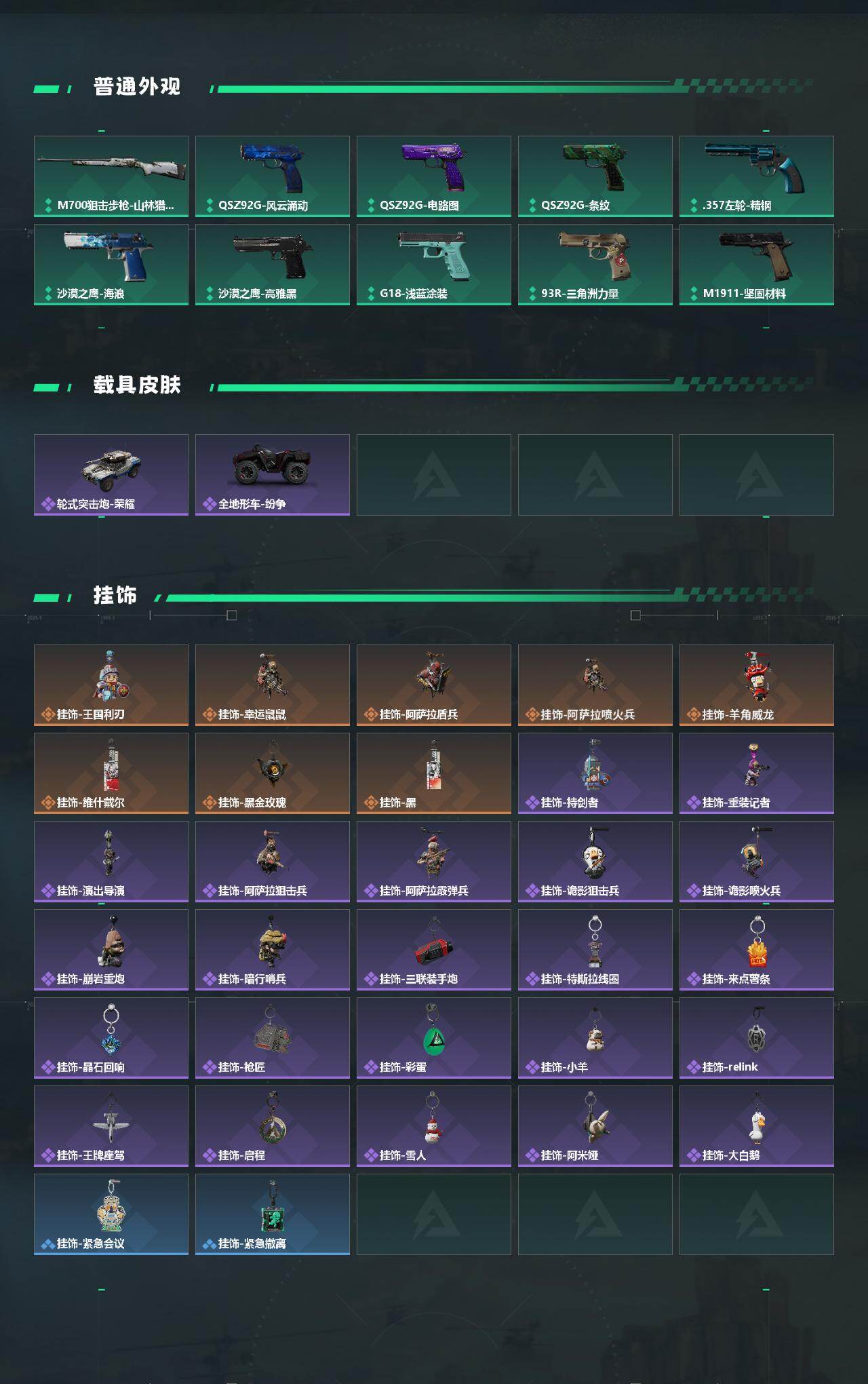 - [16516442]【特价出售/店主推荐】123m总资产-24223k哈伏币-55烽火等级-青铜-17战场等级-上等兵 【近战皮肤】:近战-黑鹰 【史诗外观】:K416突击步枪-冬日风情,腾龙突击步枪-猎鳄行动,SMG-45冲锋枪-阿萨拉特攻 【稀有外观】:K416突击步枪-一帆风顺,SCAR-H战斗步枪-荣耀列队,MP5冲锋枪-弄臣,MP5冲锋枪-哈夫克卫队,Vector冲锋枪-先锋,SMG-45-行动开启,勇士冲锋枪-冰天雪地,M1014霰弹枪-幻影结构,M249轻机枪-冰天雪地,SR-25射手步枪-开拓,G18-星链科技,G18-哈夫克航天 【普通外观】:M4A1突击步枪-粉色涂装,M4A1突击步枪-高雅黑,M4A1突击步枪-海色,QBZ95-1突击步枪-高雅黑,QBZ95-1突击步枪-海浪,QBZ95-1突击步枪-海色,QBZ95-1突击步枪-2026,K416突击步枪-几何迷彩,K416突击步枪-高雅黑,M16A4突击步枪-高雅黑,AUG突击步枪-浅蓝涂装,SG552突击步枪-海浪,SCAR-H战斗步枪-数码迷彩,PTR-32突击步枪-黄蜂,MP5冲锋枪-海色,MP5冲锋枪-黄蜂,Vector冲锋枪-几何迷彩,UZI冲锋枪-海色,野牛冲锋枪-高雅黑,M249轻机枪-黄蜂,QJB201轻机枪-典雅,SVD狙击步枪-高雅黑,SR-25射手步枪-黄蜂,SV-98狙击步枪-红色涂装,沙漠之鹰-高雅黑 【挂饰】:挂饰-赤霄游龙,挂饰-崩岩重炮*2,挂饰-福禄,挂饰-紧急撤离*17,挂饰-麻将*9