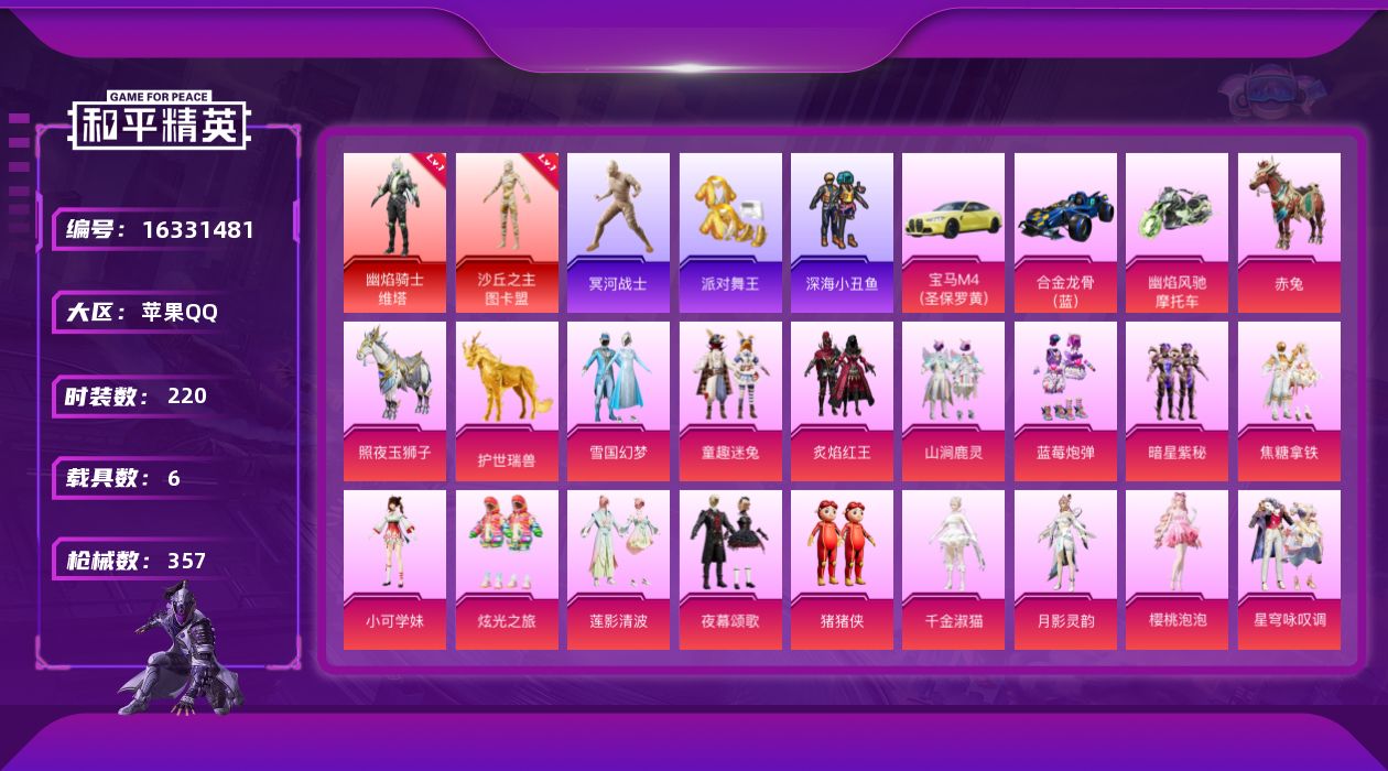 - [16143081]【店主推荐捡漏号!可直接换绑】苹果 手Q-1神装-6粉装-12特效枪-5载具-11粉色飞行器-45378热力值-4王牌印记-53套装-115枪皮【红色神装等级】:魔童闹海-哪吒(二级)【红色角色神装】:魔童闹海-哪吒【热门品类】:套装-深海小丑鱼,套装-小丑鱼【粉色套装】:角色-女娲灵识,粉装-星穹咏叹调,角色-绯穹魔姬,角色-奇迹舞步 贝贝,角色-奇迹舞步 美琪,角色-羊梦糖心【粉色枪皮等级】:AKM-炫紫旋律(四级),AUG-暖羊咩咩(五级),ARX-无垠阁(四级),Vector-最终圣卫者(三级),AKS-74U-星穹咏叹调(六级),P90-魔童闹海 敖丙(四级),Mk14-甜梦熊击(四级),DP-28-豹影疾电(五级),MG3-酷泡奶龙(二级),MG3-辉羽雀灵(六级),MG-36-沧焰双生(四级),烟雾弹-甜梦果泡(五级)【粉色载具】:宝马M4(圣保罗黄),合金龙骨(绿),星梦玉骢,冰绡玉鳞,辉羽雀灵自行车【粉色枪皮】:AKM-炫紫旋律,AUG-暖羊咩咩,ARX-无垠阁,Vector-最终圣卫者,AKS-74U-星穹咏叹调,P90-魔童闹海 敖丙,Mk14-甜梦熊击,DP-28-豹影疾电,MG3-酷泡奶龙,MG3-辉雀灵,MG-36-沧焰双生,烟雾弹-甜梦果泡 【粉色飞行器】:齐天大圣飞行器,风花雪月飞行器,镜光幻境飞行翼,雀灵庇佑飞行器,御兔特攻飞行器,终晖之翼飞行器,宁雨蝶飞行器,灵猫魔法师飞行器,飞天猪飞行器,灵珠游龙飞行器
