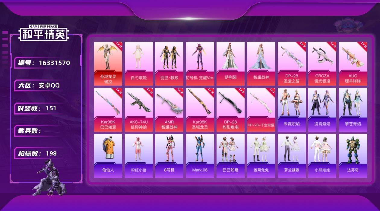 [16331570]安卓 手Q-1神装-5粉装-9特效枪-0载具-2粉色飞行器-59264热力值-9王牌印记-151套装-198枪皮 【红色神装等级】:圣域龙灵-瑞拉(二级) 【红色角色神装】:圣域龙灵-瑞拉 【热门品类】:套装-龟仙人,套装-粉红小猪,角色-8号机,角色-Mark.06 【粉色套装】:角色-白勺歌姬,套装-创世·救赎,角色-初号机 觉醒Ver.,角色-萨利娅,角色-智耀战神 【粉色枪皮等级】:GROZA-镜光银凌(五级),AUG-暖羊咩咩(五级),AKS-74U-信仰神谕(四级),Kar98K-巳巳如意(五级),Kar98K-圣域龙灵(三级),AMR-智耀战神(四级),DP-28-圣堂之誓(七级),DP-28-千金淑猫(一级),DP-28-豹影疾电(一级) 【粉色枪皮】:GROZA-镜光银凌,AUG-暖羊咩咩,AKS-74U-信仰神谕,Kar98K-巳巳如意,Kar98K-圣域龙灵,AMR-智耀战神,DP-28-圣堂之誓,DP-28-千金淑猫,DP-28-豹影疾电 【粉色飞行器】:圣域金龙飞行器 【粉色降落伞】:洛神天依降落伞,垂柳戏鸭降落伞,第五大道降落伞,蜜语绒猫降落伞,辉耀战甲降落伞,精灵梦叶罗丽降落伞,守护天翼降落伞,千金淑猫降落伞,鬼刀降落伞,圣域龙灵降落伞,智耀战神降落伞,星穹咏叹调降落伞,炫彩糖果降落伞 【稀有套装】:套装-龟仙人,套装-巳巳如意,套装-雏菊兔兔,套装-萝兰蝴蝶,套装-小熊娃娃,角色-达芬奇,套装-糖糖葫芦,套装-青团波波,套装-棉花软糖,角色-都市丽猫,角色-摩登魅猫,套装-燕燕于飞,套装-鱼渊荷华,角色-海琴烟,套装-晶灵使者,套装-晶辉守护,套装-紫幽梦,套装-蓝冰羽,角色-猎影月神,角色-瑰梦爱神,套装-星影赞美诗,套装-朱霞炽焰,套装-凌霄紫焰,套装-擎苍青焰,套装-炫彩糖果 【稀有枪皮】:AKM-夜灯,AKM-破晓战魂,AKM-霓虹街区,AKM-龙的传人,M16A4-幻世战舞者,SCAR-L-玉兔迎春,M416-糯团青竹,M416-红色方程式,GROZA-懵萌河马,GROZA-田园牧歌,GROZA-晶梦幻蝶,AUG-耀粉歌者,QBZ-洛神天依,M762-天降萌叽,Mk47-妙红点点,G36C-懵萌河马,AC-VAL-天降萌叽,AC-VAL-快闪甜心,蜜獾-垂柳戏鸭,蜜獾-天降萌叽,蜜獾-娇憨猪猪,ARX-凌霄紫焰,UZI-啾