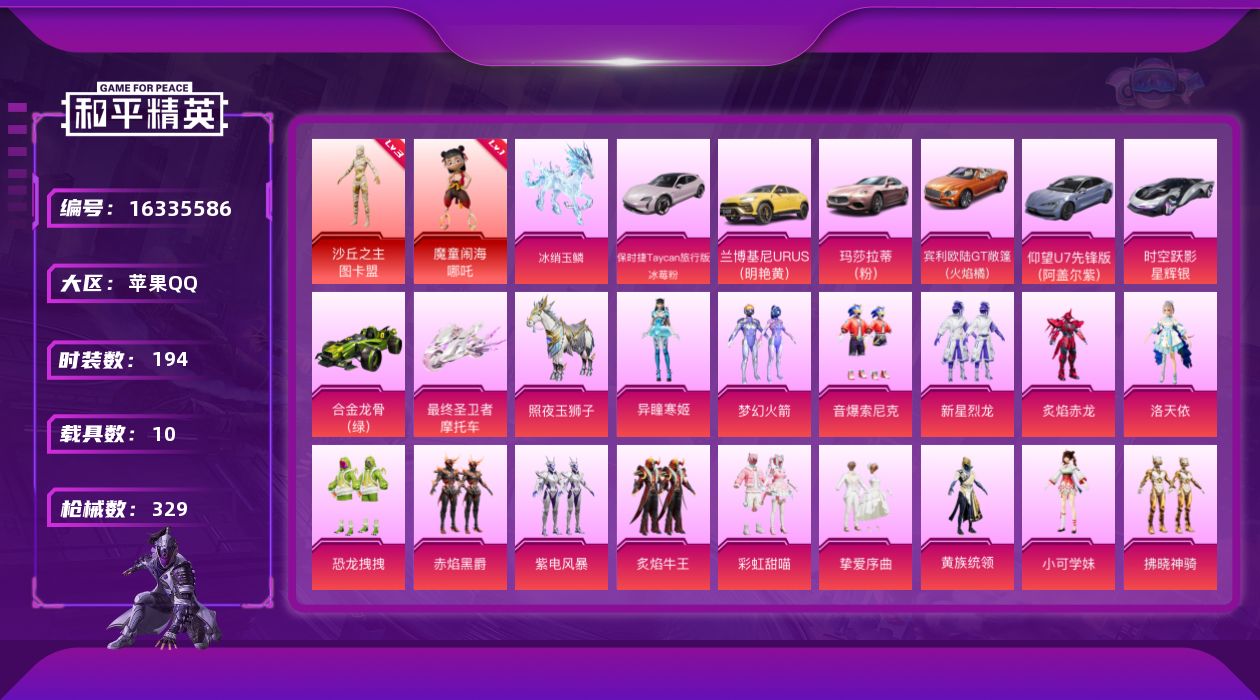 [16335586]【店主推荐捡漏号!可直接换绑】苹果 手Q-2神装-24粉装-20特效枪-10载具-18粉色飞行器-135321热力值-16王牌印记-194套装-329枪皮【红色神装等级】:魔童闹海-哪吒(一级),沙丘之主-图卡盟(三级)【红色角色神装】:魔童闹海-哪吒,沙丘之主-图卡盟【热门品类】:粉装-梦幻火箭,粉装-音爆索尼克,角色-军刀雅典娜,角色-忠真马岱,套装-龟仙人,套装-粉红小猪,大砍刀-青龙偃月刀,撬棍-龙胆亮银枪【粉色套装】:粉装-梦幻火箭,粉装-新星烈龙,粉装-炙焰赤龙,角色-洛天依,粉装-恐龙拽拽,粉装-赤焰黑爵,粉装-紫电风暴,粉装-炙焰牛王,粉装-彩虹甜喵,粉装-音爆索尼克,粉装-挚爱序曲,粉装-黄族统领,角色-小可学妹,粉装-拂晓神骑,粉装-炫光之旅,粉装-傲傲奶龙,角色-圣堂之誓,角色-光极星,套装-创世·救赎,角色-千金淑猫,粉装-星穹咏叹调,角色-罗征,角色-奇迹舞步 美雪,角色-异瞳寒姬【粉色枪皮等级】:AKM-梦之光华(七级),SCAR-L-梦幻火箭(七级),M416-风花雪月(二级),M416-墨龙九天(九级),GROZA-镜光银凌(五级),AUG-星之彼岸(五级),UMP45-恐龙拽拽(七级),Vector-环太平洋(七级),Vector-最终圣卫者(一级),AKS-74U-星穹咏叹调(五级),P90-沙丘之主(三级),P90-魔童闹海 敖丙(一级),Kar98K-巳巳如意(五级),M24-镜域双华(二级),AMR-炫光之旅(四级),M249-彩虹甜喵(一级),DP-28-豹影疾电(五级),MG3-洛神天依(七级),MG-36-沧焰双生(五级),镰刀-幽影之判(六级)【粉色载具】:兰博基尼URUS(明艳黄),玛莎拉蒂Ghibli(粉),宾利欧陆GT敞篷(火焰橘),仰望U7(阿盖尔紫),时空跃影(星辉银),保时捷Taycan 旅行版(冰莓粉),合金龙骨(绿),最终圣卫者摩托车,照夜玉狮子,冰绡玉鳞【粉色枪皮】:AKM-梦之光华,SCAR-L-梦幻火箭,M416-风花雪月,M416-墨龙九天,GROZA-镜光银凌,AUG-星之彼岸,UMP45-恐龙拽拽,Vector-环太平洋,Vector-最终圣卫者,AKS-74U-星穹咏叹调,P90-沙丘之主,P90-魔童闹海 敖丙,Kar98K-巳巳如意,M24-镜域双华,AMR-炫光之旅,M249-彩
