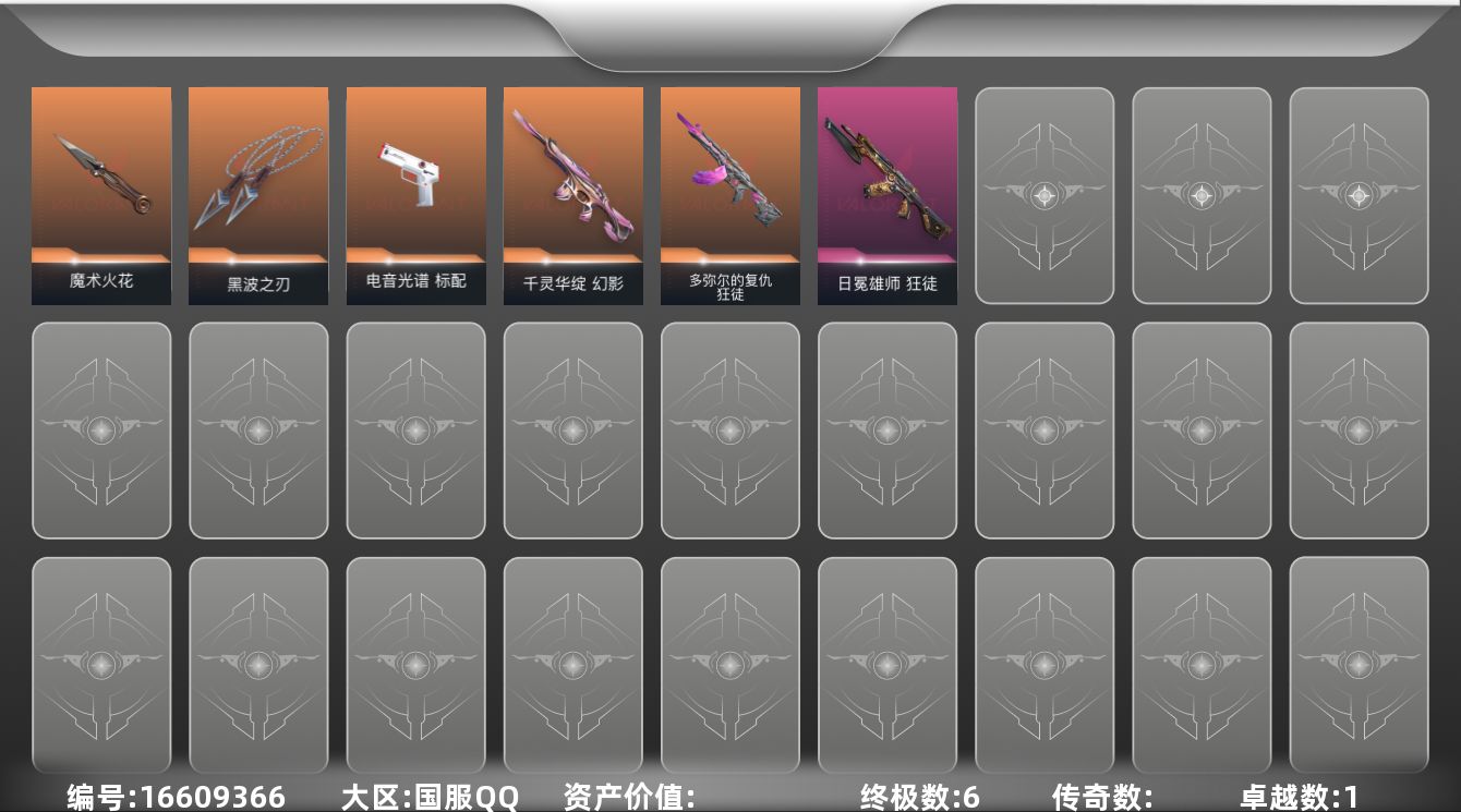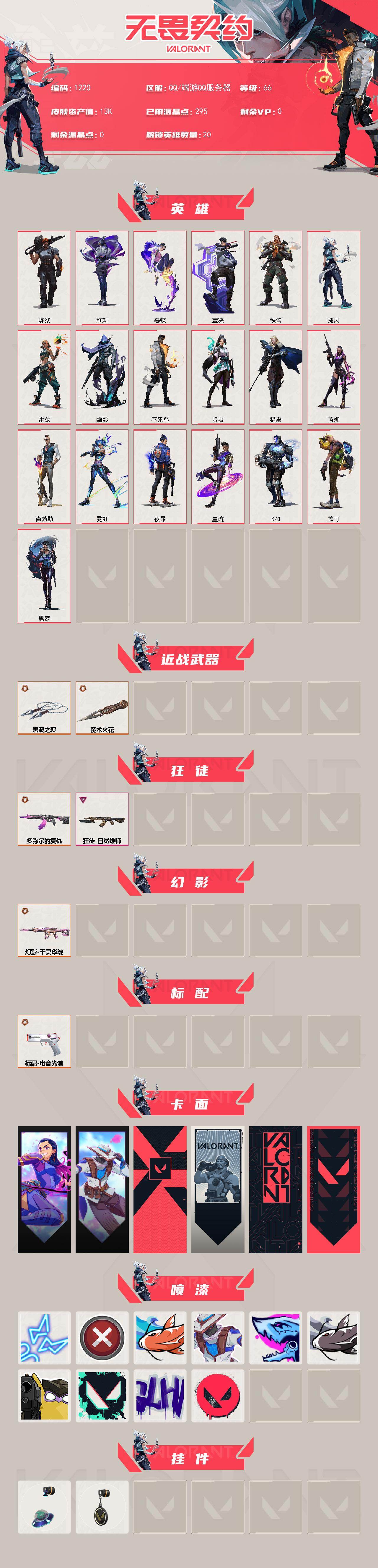 [16609366]【英雄】:炼狱,维斯,暮蝶,壹决,铁臂,捷风,雷兹,幽影,不死鸟,贤者,猎枭,芮娜,尚勃勒,霓虹,夜露,星礈,K/O,盖可,黑梦 【近战武器】:近战武器-魔术火花,近战武器-黑波之刃,近战武器-魔术火花 【狂徒】:狂徒-多弥尔的复仇,狂徒-日冕雄师 【幻影】:幻影-千灵华绽 【标配】:标配-电音光谱,标配-电音光谱 【卡面】:无畏契约GO!第一卷:芮娜 卡面,无畏契约GO!第一卷:零 卡面,代号红色 卡面,新兵报到 卡面,V契约 卡面,无畏契约 卡面 【喷漆】:霓光四射 喷漆,买装还是存钱 喷漆,红鳞 喷漆,无畏契约GO!第一卷:零 喷漆,暴走萝莉 喷漆,松叶 喷漆,放下武器 喷漆,胜利属于无畏契约 喷漆,GLHF 喷漆,无畏契约 喷漆 【挂饰】:天外飞客 挂饰,无畏契约 纪念币 挂饰