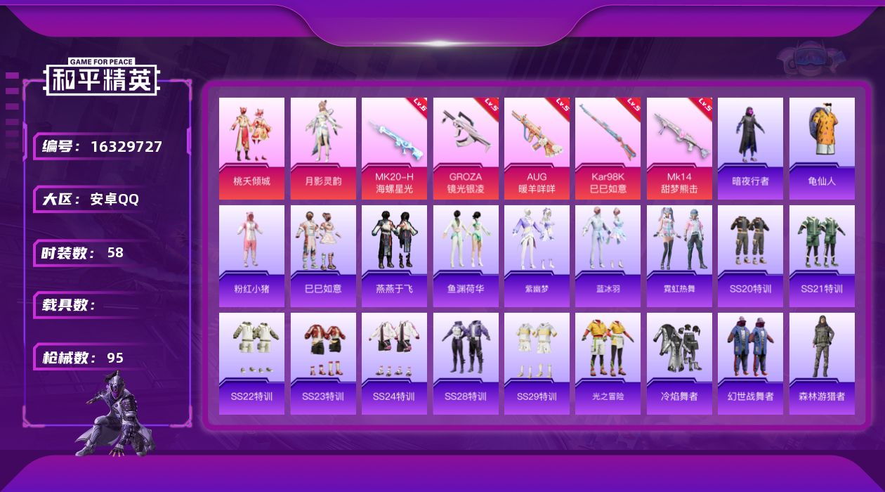 [16329727]【特价出售/店主推荐】安卓 手Q-2粉装-5特效枪-0载具-1粉色飞行器-28148热力值-2王牌印记-58套装-95枪皮 【热门品类】:套装-暗夜行者,套装-龟仙人,套装-粉红小猪 【粉色套装】:粉装-桃夭倾城,角色-月影灵韵 【粉色枪皮等级】:GROZA-镜光银凌(五级),AUG-暖羊咩咩(五级),Kar98K-巳巳如意(五级),Mk14-甜梦熊击(五级),MK20-H-海螺星光(六级) 【粉色枪皮】:GROZA-镜光银凌,AUG-暖羊咩咩,Kar98K-巳巳如意,Mk14-甜梦熊击,MK20-H-海螺星光 【粉色飞行器】:桃夭倾城飞行器 【粉色降落伞】:洛神天依降落伞,桃夭倾城降落伞,青空秋雨降落伞,海螺星光降落伞,忍者神龟降落伞,极意拳锋降落伞 【稀有套装】:套装-龟仙人,套装-巳巳如意,套装-雪国风尚,套装-燕燕于飞,套装-鱼渊荷华,套装-紫幽梦,套装-蓝冰羽,套装-霓虹热舞 【稀有枪皮】:M16A4-幻世战舞者,SCAR-L-玉兔迎春,M416-暗夜行者,M416-蓝色火焰,GROZA-田园牧歌,AUG-天降萌叽,AUG-海螺星光,AUG-耀粉歌者,QBZ-彩虹符号,M762-天降萌叽,M762-彩虹符号,Mk47-妙红点点,AC-VAL-天降萌叽,蜜獾-桃夭倾城,UZI-天降萌叽,UMP45-夜灯,Vector-生命誓言,Vector-田园牧歌,汤姆逊-天降萌叽,汤姆逊-炫彩节奏,野牛-桃夭倾城,P90-巳巳如意,Kar98K-彩虹符号,AWM-海螺星光,SKS-炫彩节奏,VSS-田园牧歌,Mini14-旋转彩虹,Mini14-耀粉歌者,Mk14-海螺星光,SLR-彩虹符号,AMR-妙红点点,AMR-暗夜行者,AMR-喜羊羊与灰太狼,S686-巳巳如意,S1897-炫彩节奏,S12K-幻世战舞者,DBS-彩虹符号,SPAS-12-田园牧歌,M249-妙红点点,M249-糯团青竹,MG3-妙红点点,MG3-幻世战舞者,MG3-惊鸿侠骨,MG3-暗夜行者,短管霰弹-星穹咏叹调,破片手榴弹-巳巳如意 【其他套装】:套装-SS20特训,套装-SS21特训,套装-SS22特训,套装-SS23特训,套装-SS24特训,套装-SS28特训,套装-SS29特训,套装-光之冒险,套装-冷焰舞者,套装-幻世战舞者,套装-森林游猎者,套装-湖蓝色名流,套装-牛气满满,套装