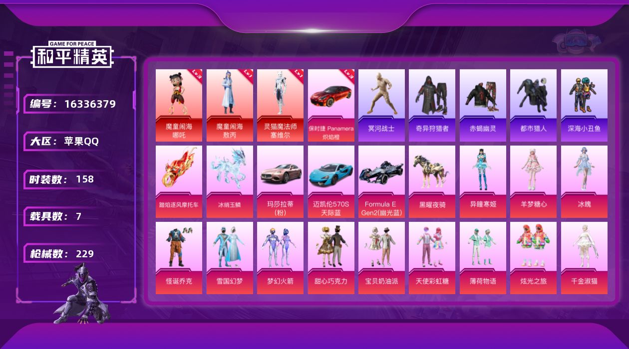 [16336379]【特价出售/店主推荐】苹果 手Q-无敌战神框-3神装-13粉装-12特效枪-7载具-8粉色飞行器-94284热力值-14王牌印记-158套装-229枪皮 【红色载具】:保时捷Panamera(炽焰橙)(三级) 【红色神装等级】:魔童闹海-敖丙(一级),魔童闹海-哪吒(三级),灵猫魔法师-塞维尔(一级) 【红色角色神装】:魔童闹海-敖丙,魔童闹海-哪吒,灵猫魔法师-塞维尔 【热门品类】:粉装-怪诞乔克,粉装-雪国幻梦,粉装-梦幻火箭,套装-赤蝎幽灵,套装-都市猎人,套装-冥河战士,套装-深海小丑鱼,套装-小丑鱼,套装-奇异狩猎者,套装-金羽特工,套装-龟仙人,套装-暗影哥特 【粉色套装】:粉装-怪诞乔克,粉装-甜心巧克力,粉装-宝贝奶油派,粉装-天使彩虹糖,粉装-雪国幻梦,粉装-梦幻火箭,粉装-薄荷物语,粉装-炫光之旅,角色-千金淑猫,粉装-星穹咏叹调,角色-冰魄,角色-羊梦糖心,角色-异瞳寒姬 【粉色枪皮等级】:AKM-炫紫旋律(七级),SCAR-L-魔童闹海 哪吒(三级),M416-心之恋语(七级),M416-灵猫魔法师(三级),蜜獾-异瞳寒姬(三级),AKS-74U-无垠阁(三级),P90-魔童闹海 敖丙(三级),Kar98K-巳巳如意(五级),DP-28-豹影疾电(五级),MG-36-沧焰双生(五级),平底锅-喜羊羊与灰太狼(三级) 【粉色载具】:玛莎拉蒂Ghibli(粉),迈凯伦570S(天际蓝),保时捷Panamera(炽焰橙),Formula E Gen2(幽光蓝),踏焰逐风摩托车,僚机-冰龙团团,黑曜夜骑,冰绡玉鳞 【粉色枪皮】:AKM-炫紫旋律,SCAR-L-魔童闹海 哪吒,M416-心之恋语,M416-灵猫魔法师,蜜獾-异瞳寒姬,AKS-74U-无垠阁,P90-魔童闹海 敖丙,Kar98K-巳巳如意,DP-28-豹影疾电,MG-36-沧焰双生,平底锅-喜羊羊与灰太狼,烟雾弹-猫咪绅士 【粉色飞行器】:星空武士飞行器,脆鲨七海飞行器,万象金身飞行器,灵猫魔法师飞行器,飞天猪飞行器,灵珠游龙飞行器 【粉色降落伞】:绝对恒星降落伞,甜心宝贝降落伞,梦幻火箭降落伞,星之彼岸降落伞,怪笑疯兔降落伞,青春物语降落伞,环太平洋降落伞,垂柳戏鸭降落伞,彩虹甜喵降落伞,第五大道降落伞,炫光之旅降落伞,莲影清波降落伞,繁龙极客降落伞,精灵梦叶罗丽降落伞,墨龙九天降落
