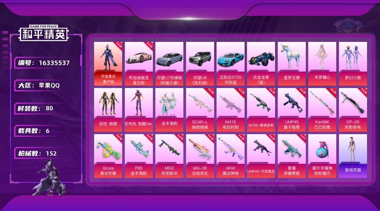 [16335537]【店主推荐捡漏号!可直接换绑】苹果 手Q-1神装-5粉装-14特效枪-6载具-2粉色飞行器-57629热力值-5王牌印记-80套装-152枪皮