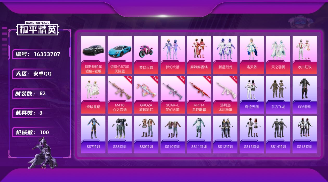[16333707]【店主推荐捡漏号!可直接换绑】安卓 手Q-7粉装-5特效枪-3载具-2粉色飞行器-39776热力值-1王牌印记-82套装-100枪皮 【热门品类】:粉装-梦幻火箭 【粉色套装】:粉装-梦幻火箭,粉装-麻辣鲜香锅,粉装-新星烈龙,角色-洛天依,粉装-天之羽翼,粉装-冰川红玫,粉装-纯珍童话 【粉色枪皮等级】:SCAR-L-梦幻火箭(四级),M416-心之恋语(六级),GROZA-旋转彩虹(五级),汤姆逊-冰川粉黛(三级),Mini14-龙虾霸霸(四级) 【粉色载具】:特斯拉Model 3(冷光银),迈凯伦570S(天际蓝),双人摩托-梦幻火箭 【粉色枪皮】:SCAR-L-梦幻火箭,M416-心之恋语,GROZA-旋转彩虹,汤姆逊-冰川粉黛,Mini14-龙虾霸霸 【粉色飞行器】:梦幻火箭飞行器,天之羽翼飞行器 【粉色降落伞】:深海曼妙降落伞,梦幻火箭降落伞,龙虾霸霸降落伞,炫紫旋律降落伞,心之恋语降落伞,王牌四分卫降落伞,洛神天依降落伞,天之羽翼降落伞,旋转彩虹降落伞,冰川粉黛降落伞 【稀有枪皮】:AKM-夜灯,AKM-星之信仰,AKM-春暖花开,AKM-灼热熔岩,AKM-破晓战魂,M16A4-龙虾霸霸,M416-夜灯,GROZA-异彩先驱,GROZA-春暖花开,GROZA-治愈之星,GROZA-生命誓言,GROZA-田园牧歌,GROZA-黑色刀锋,AUG-天降萌叽,AUG-耀粉歌者,QBZ-彩虹符号,QBZ-洛神天依,M762-彩虹甜喵,M762-深海曼妙,M762-牛气冲天,Mk47-洛神天依,AC-VAL-天降萌叽,蜜獾-娇憨猪猪,UZI-娇憨猪猪,UMP45-生命誓言,Vector-夜灯,Vector-彩虹符号,Vector-治愈之星,Vector-生命誓言,Vector-田园牧歌,Vector-黑色刀锋,Vector-龙虾霸霸,汤姆逊-勇闯险境,汤姆逊-奇异狩猎者,汤姆逊-异彩先驱,汤姆逊-耀粉歌者,MP5K-异彩先驱,Kar98K-勇闯险境,Kar98K-彩虹符号,Kar98K-梦幻火箭,Kar98K-洛神天依,M24-治愈之星,SKS-勇闯险境,SKS-天之羽翼,SKS-心之恋语,VSS-田园牧歌,VSS-黑色刀锋,Mini14-异彩先驱,Mini14-旋转彩虹,Mini14-春暖花开,Mini14-梦幻火箭,Mini14-耀粉歌者,Mini14-金鼠