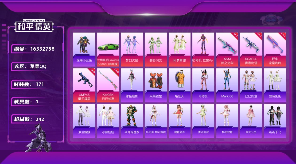 [16332758]【店主推荐捡漏号!可直接换绑】苹果 手Q-4粉装-5特效枪-1载具-0粉色飞行器-77137热力值-13王牌印记-171套装-242枪皮【热门品类】:粉装-梦幻火箭,套装-深海小丑鱼,套装-龟仙人,角色-8号机,角色-Mark.06【粉色套装】:粉装-梦幻火箭,粉装-碧影闪光,粉装-闲梦青缨,角色-初号机 觉醒Ver.【粉色枪皮等级】:AKM-梦之光华(七级),SCAR-L-青春物语(七级),UMP45-量子极限(五级),野牛-流星咚咚(七级),Kar98K-巳巳如意(五级)【粉色载具】:兰博基尼Aventador SVJ(翡翠绿)【粉色枪皮】:AKM-梦之光华,SCAR-L-青春物语,UMP45-量子极限,野牛-流星咚咚,Kar98K-巳巳如意