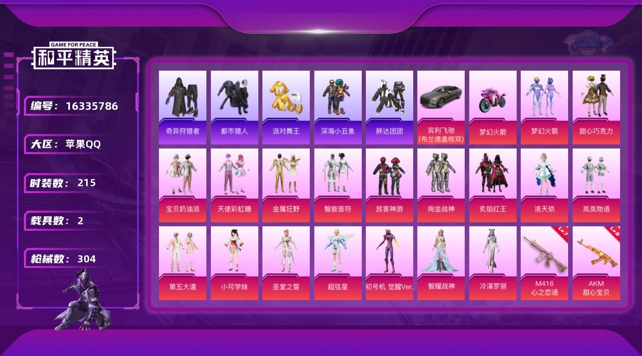 [16335786]【特价出售/店主推荐】苹果 手Q-无敌战神框-18粉装-12特效枪-2载具-6粉色飞行器-106740热力值-17王牌印记-215套装-304枪皮