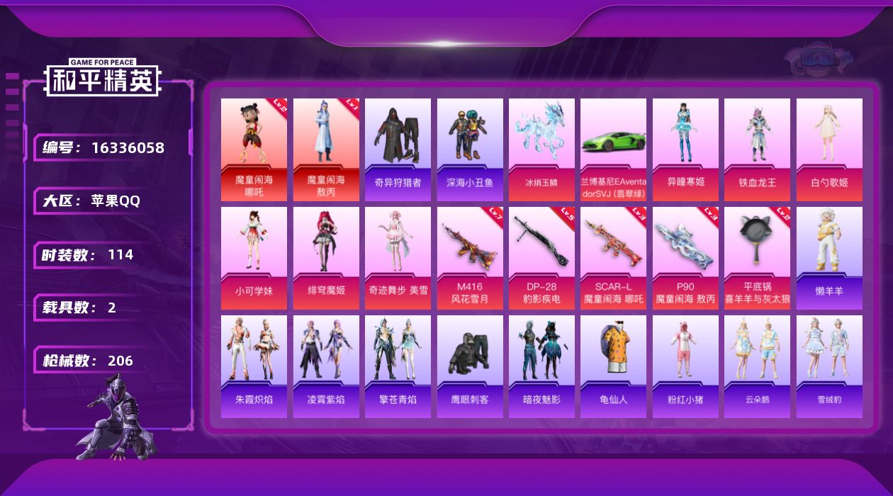 [16336058]【特价出售/店主推荐】 苹果 手Q-无敌战神框-2神装-6粉装-7特效枪-2载具-4粉色飞行器-63827热力值-14王牌印记-114套装-206枪皮【红色神装等级】:魔童闹海-敖丙(一级),魔童闹海-哪吒(二级)【红色角色神装】:魔童闹海-敖丙,魔童闹海-哪吒【热门品类】:套装-深海小丑鱼,套装-奇异狩猎者,套装-龟仙人,套装-粉红小猪【粉色套装】:粉装-铁血龙王,角色-白勺歌姬,角色-小可学妹,角色-绯穹魔姬,角色-奇迹舞步 雪,角色-异瞳寒姬【粉色枪皮等级】:AKM-暮色玫影(三级),SCAR-L-魔童闹海 哪吒(三级),M416-风花雪月(七级),P90-魔童闹海 敖丙(三级),DP-28-豹影疾电(五级),平底锅-喜羊羊与灰太狼(二级)【粉色载具】:兰博基尼Aventador SVJ(翡翠绿),冰绡玉鳞【粉色枪皮】:AKM-暮色玫影,SCAR-L-魔童闹海 哪吒,M416-风花雪月,AUG-罪夜之冕,P90-魔童闹海 敖丙,DP-28-豹影疾电,平底锅-喜羊羊与灰太狼【粉色飞行器】:灵猫魔法师飞行器,飞天猪飞行器,灵珠游龙飞行器