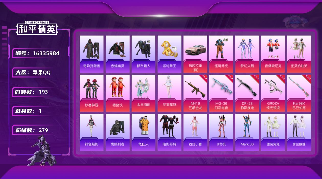 【粉色枪皮等级】:M416-五爪金龙(七级),GROZA-镜光银凌(五级),Kar98K-巳巳如意(五级),DP-28-豹影疾电(五级),MG-36-幻彩电音(七级)