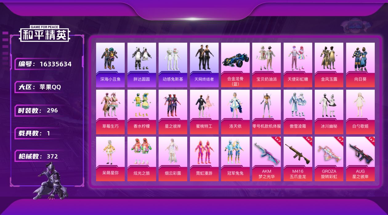[16335634]【特价出售/店主推荐】苹果 手Q-无敌战神框-18粉装-10特效枪-1载具-5粉色飞行器-12w热力值-25王牌印记-296套装-372枪皮