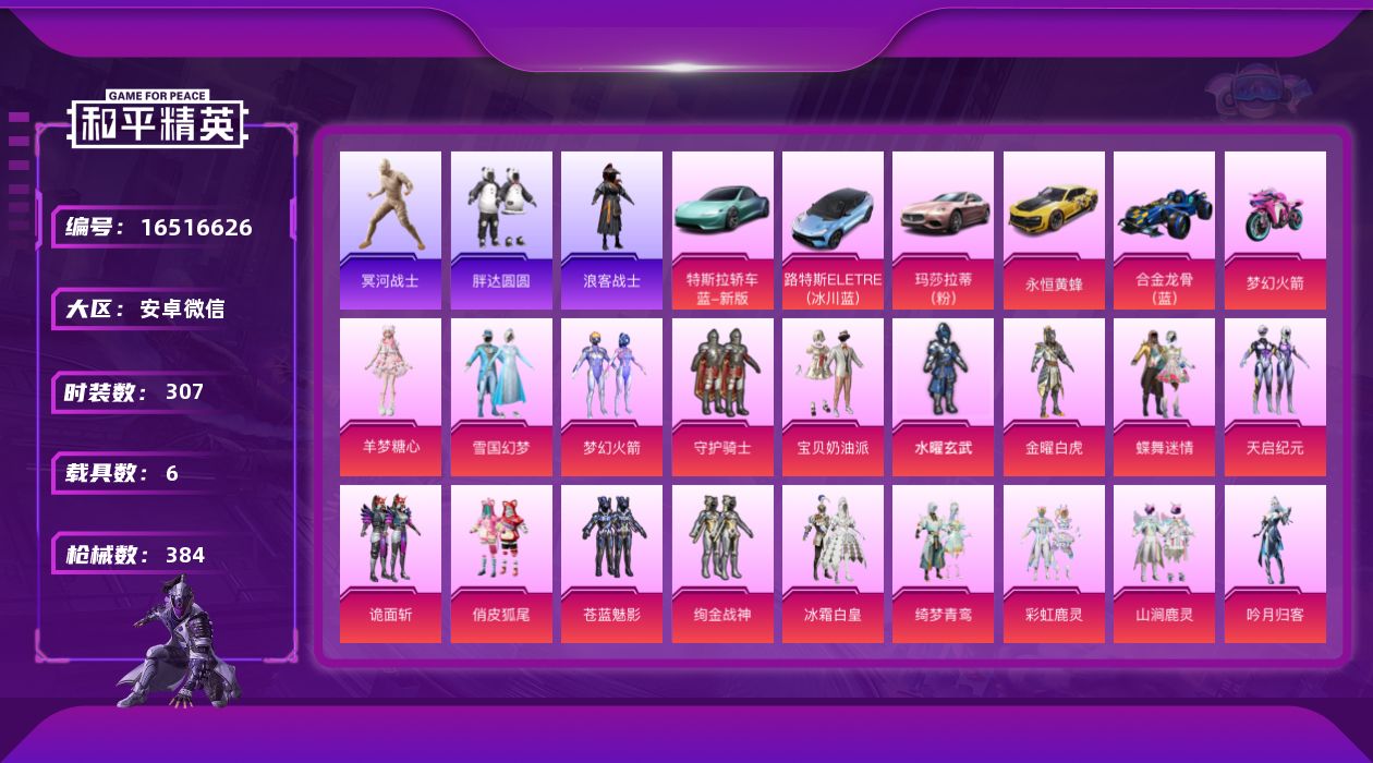 [16516626]【特价出售/店主推荐】安卓 微信-23粉装-11特效枪-6载具-11粉色飞行器-145737热力值-32王牌印记-307套装-384枪皮 【热门品类】:粉装-雪国幻梦,粉装-梦幻火箭,绝对防御上衣,套装-冥河战士,套装-小丑鱼,套装-胖达圆圆,套装-金羽特工,套装-星河浪客,套装-浪客战士,套装-SS1特训,旭日初心兜帽大衣,套装-龟仙人,套装-暗影哥特,套装-粉红小猪,熔岩游骑兵连帽夹克 【粉色套装】:粉装-守护骑士,粉装-宝贝奶油派,粉装-水曜玄武,粉装-金曜白虎,粉装-雪国幻梦,粉装-蝶舞迷情,粉装-梦幻火箭,粉装-天启纪元,粉装-诡面斩,粉装-俏皮狐尾,粉装-苍蓝魅影,粉装-绚金战神,粉装-冰霜白皇,粉装-绮梦青鸾,粉装-彩虹鹿灵,粉装-山涧鹿灵,粉装-吟月归客,粉装-蓝莓炮弹,粉装-绚金瑰梦,粉装-流星咚咚,粉装-闲梦青缨,角色-星云暗核,角色-羊梦糖心 【粉色枪皮等级】:AKM-甜心宝贝(七级),SCAR-L-梦幻火箭(七级),M416-五爪金龙(七级),GROZA-焦糖拿铁(七级),M762-激战未来(五级),UZI-绮梦青鸾(五级),UMP45-雪国精灵(七级),Kar98K-巳巳如意(五级),M24-星之信仰(七级),DP-28-豹影疾电(五级),MG-36-沧焰双生(五级) 【粉色载具】:特斯拉Roadster(水滴蓝),路特斯ELETRE(冰川蓝),玛莎拉蒂Ghibli(粉),永恒黄蜂,合金龙骨(蓝),双人摩托-梦幻火箭 【粉色枪皮】:AKM-甜心宝贝,SCAR-L-梦幻火箭,M416-五爪金龙,GROZA-焦糖拿铁,M762-激战未来,UZI-绮梦青鸾,UMP45-雪国精灵,Kar98K-巳巳如意,M24-星之信仰,DP-28-豹影疾电,MG-36-沧焰双生 【粉色飞行器】:春暖花开飞行器,梦幻火箭飞行器,神秘黑猫飞行器,锦绣火鲤飞行器,荧光虫舞飞行器,绮梦青鸾飞行器,星之彼岸飞行器,天之羽翼飞行器,龙翔九天飞行器,凤舞九天飞行器 【粉色降落伞】:甜心宝贝降落伞,雪国幻梦降落伞,春暖花开降落伞,梦幻火箭降落伞,星之信仰降落伞,神秘黑猫降落伞,四圣焕新降落伞,诡面斩降落伞,锦绣火鲤降落伞,夏日绵绵冰降落伞,绮梦青鸾降落伞,星之彼岸降落伞,林间仙鹿降落伞,洛神天依降落伞,绚金瑰梦降落伞,焦糖拿铁降落伞,星夜魔法师降落伞,璀璨巨星降落伞,莲影清波