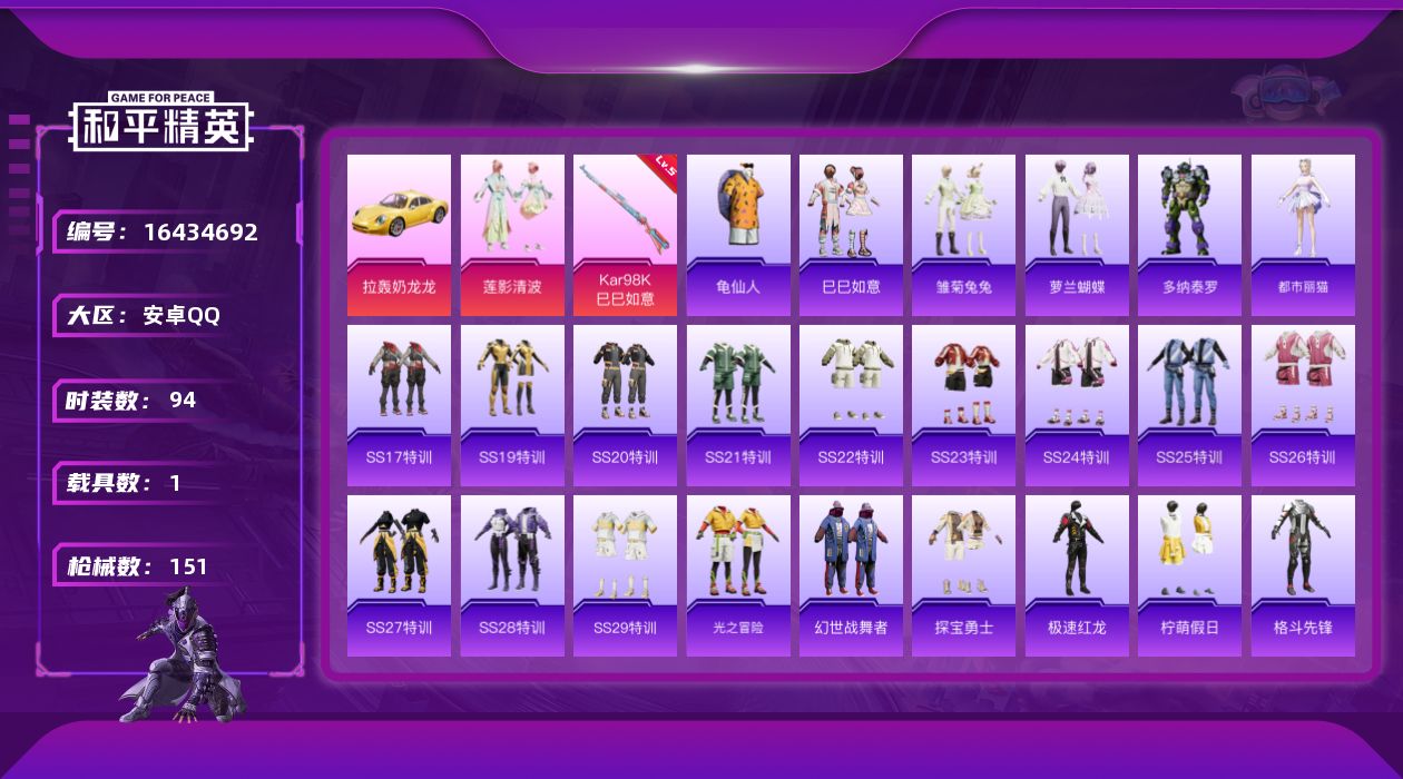 - [14806545]可二次【店主推荐捡漏号!可直接换绑】 安卓 手Q-2粉装-3特效枪-0载具-1粉色飞行器-33371热力值-6王牌印记-107套装-121枪皮 【热门品类】:套装-龟仙人,套装-粉红小猪,角色-Mark.06 【粉色套装】:粉装-霓虹漫游,粉装-星穹咏叹调 【粉色枪皮等级】:Kar98K-创世·救赎(六级),Kar98K-巳巳如意(五级),DP-28-豹影疾电(五级) 【粉色枪皮】:Kar98K-创世·救赎,Kar98K-巳巳如意,DP-28-豹影疾电 【粉色降落伞】:蜜语绒猫降落伞,精灵梦叶罗丽降落伞,初号机 觉醒Ver.降落伞,月下星之子降落伞,星穹咏叹调降落伞 【稀有套装】:套装-龟仙人,套装-巳巳如意,套装-小鸟芋圆,套装-雪国风尚,套装-雏菊兔兔,套装-萝兰蝴蝶,角色-多纳泰罗,套装-燕燕于飞,套装-鱼渊荷华,套装-粉恋花,套装-紫幽梦,套装-蓝冰羽,套装-星渊小夜曲,套装-霓虹热舞,套装-云朵鹅,套装-雪绒豹,角色-乐音,套装-雁字回时 【稀有枪皮】:AKM-破晓战魂,AKM-缤纷海域,SCAR-L-夜灯,SCAR-L-玉兔迎春,SCAR-L-小狗蛇点点,SCAR-L-冷漠罗丽,M416-红色方程式,M416-蓝色火焰,AUG-天降萌叽,AUG-甜蜜菠萝,AUG-耀粉歌者,QBZ-彩虹符号,M762-云朵鹅,G36C-桃粉嫣然,G36C-星穹咏叹调,AC-VAL-天降萌叽,蜜獾-天降萌叽,UZI-天降萌叽,UZI-影袭,UMP45-夜灯,UMP45-蓝色火焰,Vector-焰鹰斗篷,Vector-生命誓言,汤姆逊-智耀战神,JS9-蓝晶绮麟,P90-巳巳如意,Kar98K-星穹咏叹调,AWM-焰鹰斗篷,SKS-炫彩节奏,SVD-云朵鹅,SVD-冷漠罗丽,S686-生命誓言,S12K-玩趣呆呆,S12K-破晓战魂,S12K-夜灯,DBS-焰鹰斗篷,DBS-彩虹符号,SPAS-12-云朵鹅,M249-百万伏特,M249-糯团青竹,DP-28-焰鹰斗篷,MG3-幻世战舞者,R45-幻彩电音,短管霰弹-星穹咏叹调,蝎式手枪-六号稻草人,沙漠之鹰-绝色倾城,沙漠之鹰-云朵鹅,战术弩-江南烟雨,爆炸猎弓-雪月幻音,大砍刀-云朵鹅,破片手榴弹-巳巳如意 【其他套装】:套装-SS21特训,套装-SS22特训,套装-SS27特训,套装-SS28特训,套装-SS29特训,