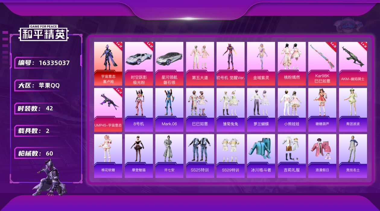 [16335037]【特价出售/店主推荐】 苹果 手Q-1神装-4粉装-3特效枪-2载具-2粉色飞行器-27612热力值-1王牌印记-42套装-60枪皮【红色载具】:时空跃影(极光粉)(二级)【红色神装等级】:宇宙意志-塞卢姆(二级)【红色角色神装】:宇宙意志-塞卢姆【热门品类】:角色-8号机,角色-Mark.06【粉色套装】:粉装-第五大道,角色-初号机 觉醒Ver.,角色-金域紫灵,粉装-桃粉嫣然【粉色枪皮等级】:AKM-幽焰骑士(三级),UMP45-宇宙意志(三级),Kar98K-巳巳如意(五级)【粉色载具】:星河领航(磐石银),时空跃影(极光粉)【粉色枪皮】:AKM-幽焰骑士,UMP45-宇宙意志,Kar98K-巳巳如意【粉色飞行器】:深渊漩涡飞行器,曦光华影飞行器