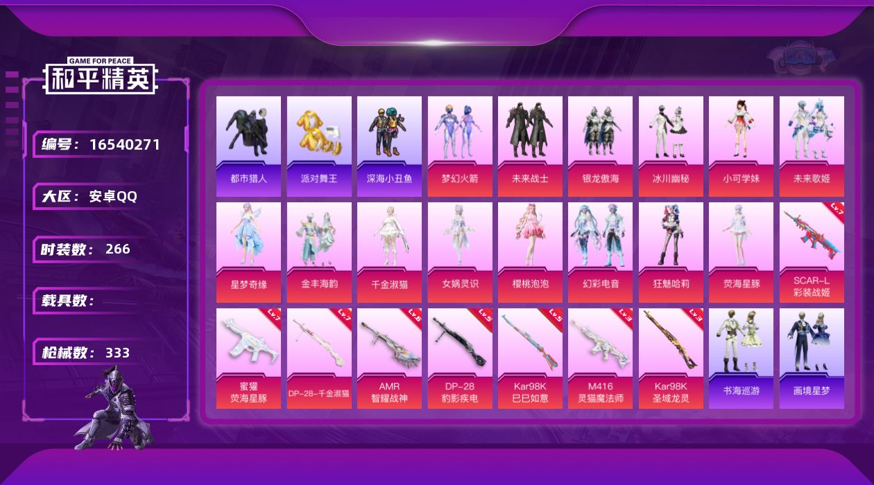 - PX_2081380- 安卓手Q-10王牌印记-9粉装-8特效枪-1载具-71915热力值-182套装-220枪皮-6卓越印记-4传奇印记 【9粉装】,梦幻火箭,繁龙极客,第五大道,冷漠罗丽,幻影飞狐,时空协奏·火花,垂柳戏鸭,女娲灵识,绚金战神 【8特效枪】SCAR-L-锦绣绵绵-5级 M416-电玩时刻-5级 GROZA-镜光银凌-5级 AUG-暖羊咩咩-5级 Kar98K-巳巳如意-5级 U