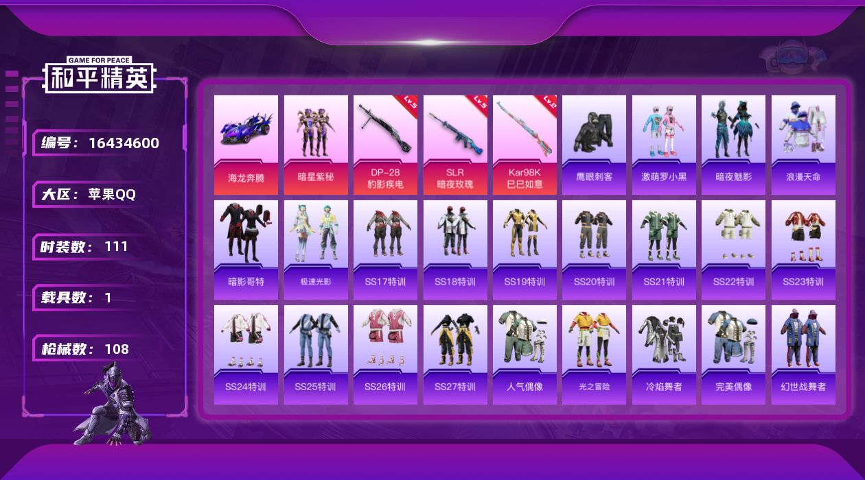 [16434600]【店主推荐捡漏号!可直接换绑】苹果 手Q-1粉装-3特效枪-1载具-1粉色飞行器-34713热力值-4王牌印记-111套装-108枪皮【热门品类】:套装-浪漫天命,套装-暗影哥特【粉色套装】:粉装-暗星紫秘【粉色枪皮等级】:Kar98K-巳巳如意(二级),SLR-暗夜玫瑰(五级),DP-28-豹影疾电(五级)【粉色载具】:海龙奔腾【粉色枪皮】:Kar98K-巳巳如意,SLR-暗夜玫瑰,DP-28-豹影疾电