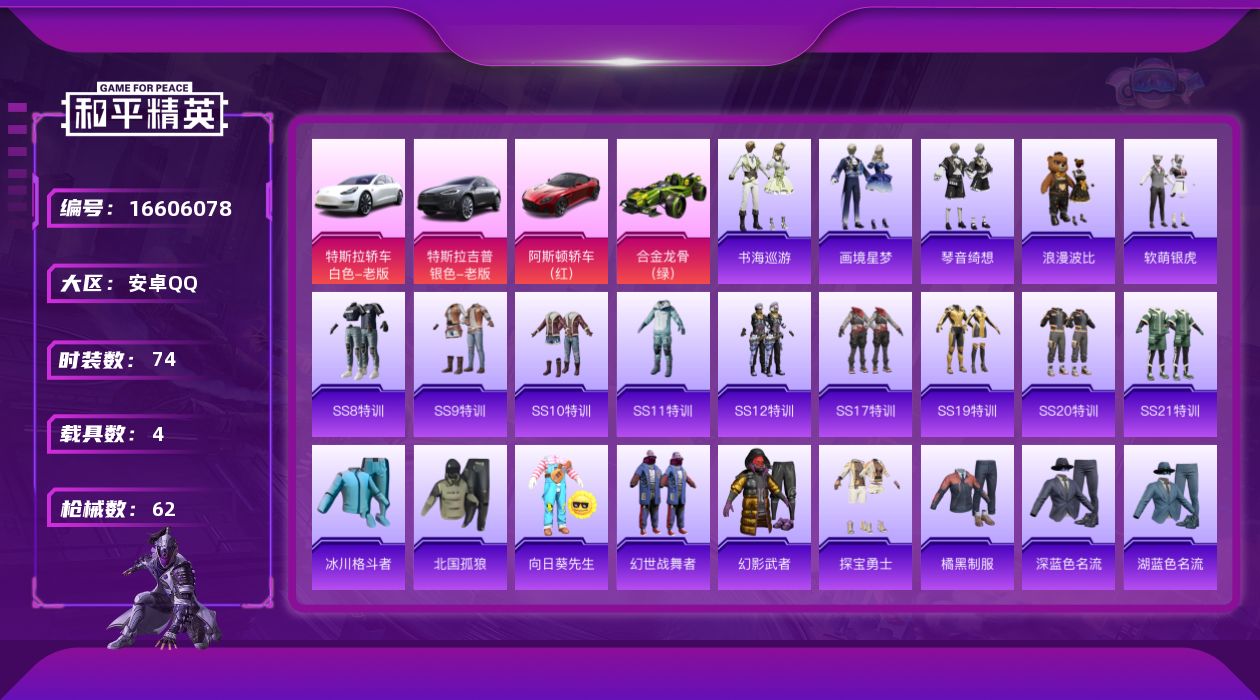 [16606078]【店主推荐捡漏号!可直接换绑】安卓 手Q-0粉装-0特效枪-4载具-1粉色飞行器-25291热力值-3王牌印记-74套装-62枪皮【热门品类】:套装-浪漫波比【粉色载具】:特斯拉Model 3(珍珠白),特斯拉Model X(冷光银),阿斯顿马丁DBS(红),合金龙骨(绿)