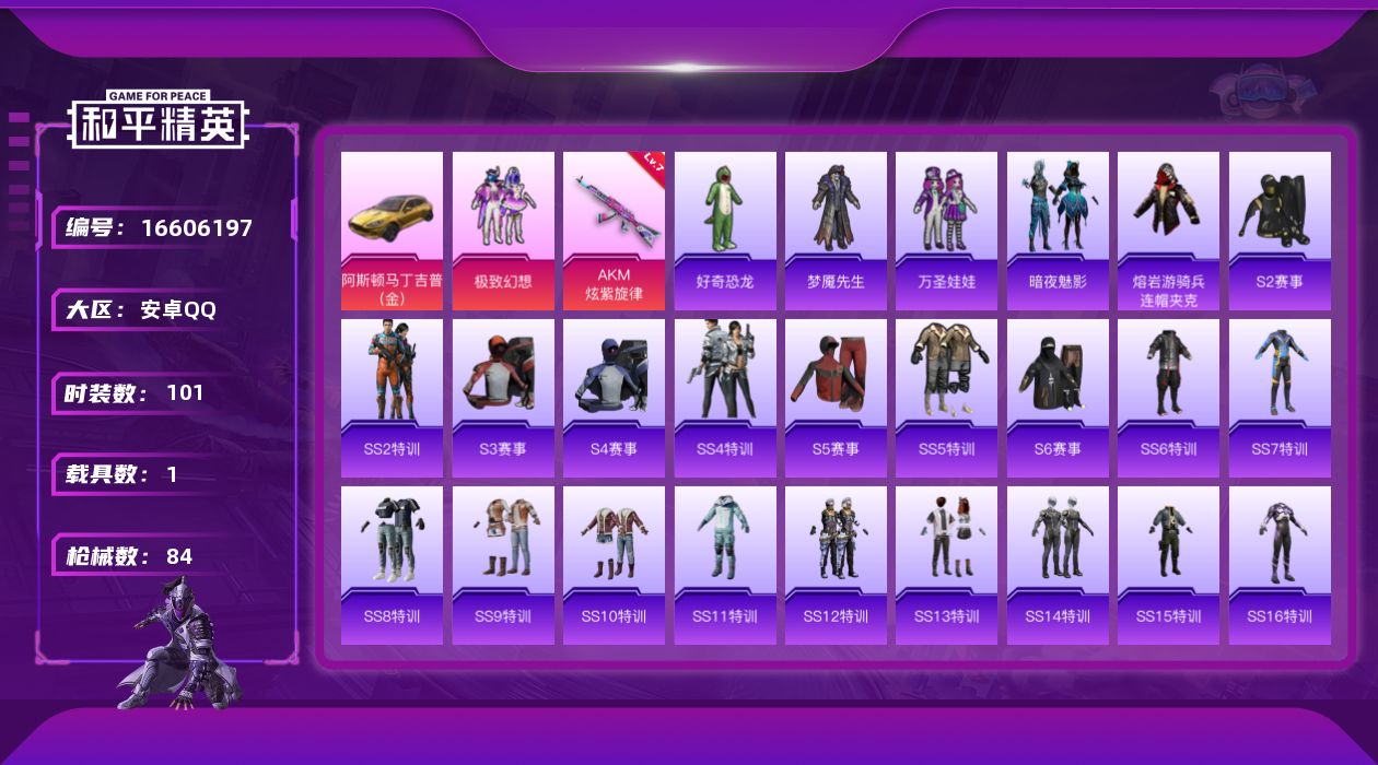 [16606197]【店主推荐捡漏号!可直接换绑】安卓 手Q-1粉装-1特效枪-1载具-0粉色飞行器-30083热力值-15王牌印记-101套装-84枪皮【热门品类】:套装-SS1特训,熔岩游骑兵连帽夹克【粉色套装】:粉装-极致幻想【粉色枪皮等级】:AKM-炫紫旋律(七级)【粉色载具】:阿斯顿马丁DBX(金)【粉色枪皮】:AKM-炫紫旋律