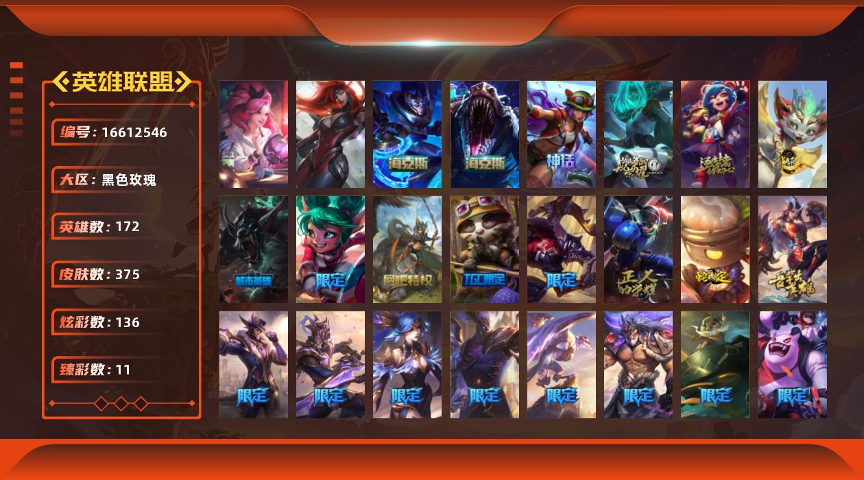 [16612546]可二次【店主推荐捡漏号】白银段位-172英雄-375皮肤-136炫彩-4终极-6神话-27限定-36传说-95史诗