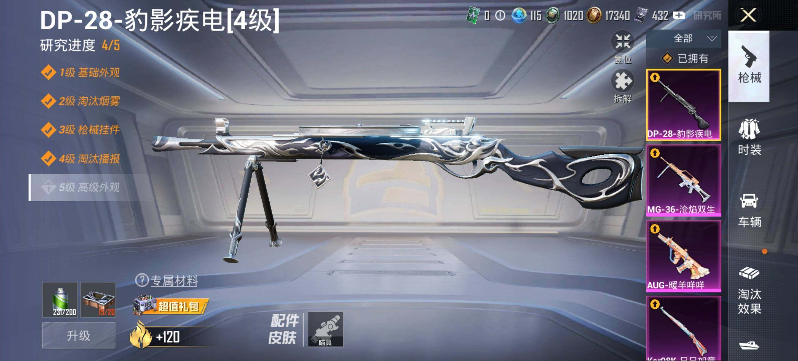 【粉色枪皮等级】:AKM-梦之光华(七级),SCAR-L-纯梦嫁纱(七级),M416-风花雪月(七级),M416-电玩时刻(五级),GROZA-镜光银凌(五级),AUG-暖羊咩咩(五级),Kar98K-伏魔团(五级),Kar98K-巳巳如意(五级),DP-28-豹影疾电(四级),MG-36-沧焰双生(五级)