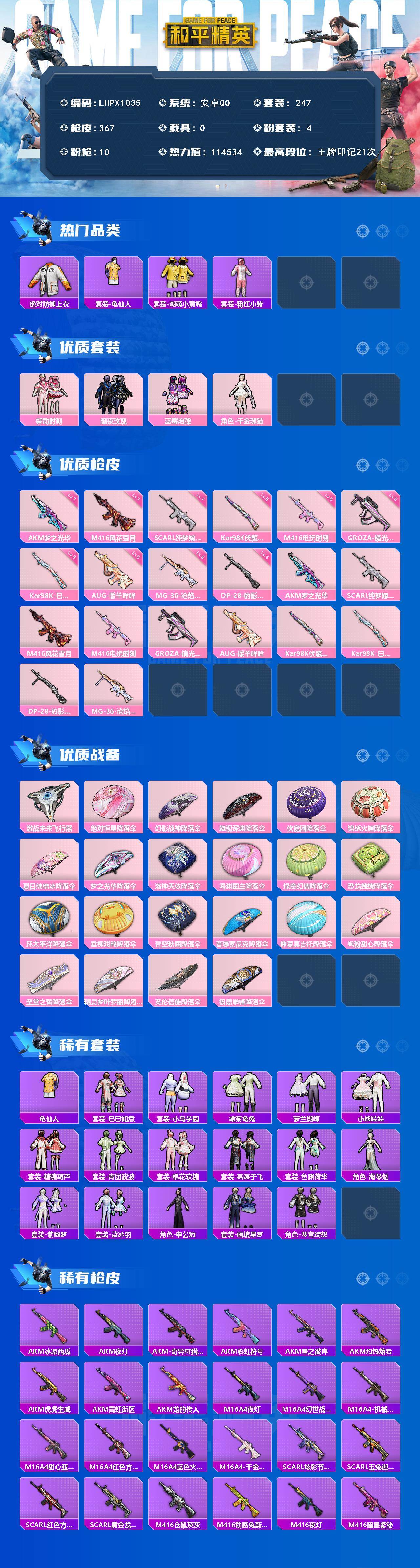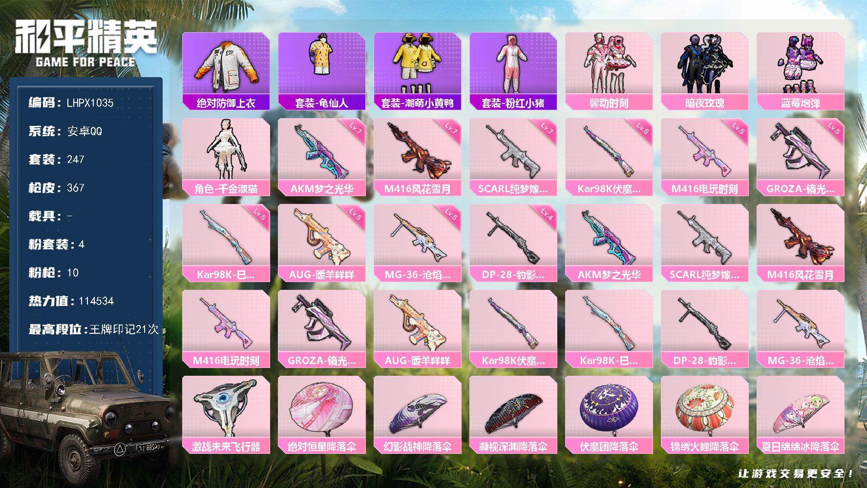 [16605975]可二次【特价出售/店主推荐】安卓 手Q-4粉装-10特效枪-0载具-2粉色飞行器-114534热力值-21王牌印记-247套装-367枪皮 【热门品类】:绝对防御上衣,套装-龟仙人,套装-潮萌小黄鸭,套装-粉红小猪 【粉色套装】:粉装-馨动时刻,粉装-暗夜玫瑰,粉装-蓝莓炮弹,角色-千金淑猫 【粉色枪皮等级】:AKM-梦之光华(七级),SCAR-L-纯梦嫁纱(七级),M416-风花雪月(七级),M416-电玩时刻(五级),GROZA-镜光银凌(五级),AUG-暖羊咩咩(五级),Kar98K-伏魔团(五级),Kar98K-巳巳如意(五级),DP-28-豹影疾电(四级),MG-36-沧焰双生(五级) 【粉色枪皮】:AKM-梦之光华,SCAR-L-纯梦嫁纱,M416-风花雪月,M416-电玩时刻,GROZA-镜光银凌,AUG-暖羊咩咩,Kar98K-伏魔团,Kar98K-巳巳如意,DP-28-豹影疾电,MG-36-沧焰双生 【粉色飞行器】:激战未来飞行器 【粉色降落伞】:绝对恒星降落伞,幻影战神降落伞,凝视深渊降落伞,伏魔团降落伞,锦绣火鲤降落伞,夏日绵绵冰降落伞,梦之光华降落伞,洛神天依降落伞,海渊国主降落伞,绿意幻情降落伞,恐龙拽拽降落伞,环太平洋降落伞,垂柳戏鸭降落伞,青空秋雨降落伞,音爆索尼克降落伞,仲夏莫吉托降落伞,飒粉甜心降落伞,圣堂之誓降落伞,精灵梦叶罗丽降落伞,英伦信使降落伞,极意拳锋降落伞,炫彩糖果降落伞 【稀有套装】:套装-龟仙人,套装-巳巳如意,套装-小鸟芋圆,套装-炫彩糖果,套装-雏菊兔兔,套装-萝兰蝴蝶,套装-小熊娃娃,套装-糖糖葫芦,套装-青团波波,套装-棉花软糖,套装-燕燕于飞,套装-鱼渊荷华,角色-海琴烟,套装-紫幽梦,套装-蓝冰羽,角色-申公豹,套装-画境星梦,套装-琴音绮想 【稀有枪皮】:AUG-冰晶雪宝,AKM-冰凉西瓜,AKM-夜灯,AKM-奇异狩猎者,AKM-彩虹符号,AKM-星之彼岸,AKM-灼热熔岩,AKM-虎虎生威,AKM-霓虹街区,AKM-龙的传人,M16A4-夜灯,M16A4-幻世战舞者,M16A4-机械英豪,M16A4-甜心亚梦,M16A4-红色方程式,M16A4-蓝色火焰,M16A4-千金淑猫,SCAR-L-炫彩节奏,SCAR-L-玉兔迎春,SCAR-L-红色方程式,SCAR-L-黄金龙骨,M416-仓鼠灰灰,M4