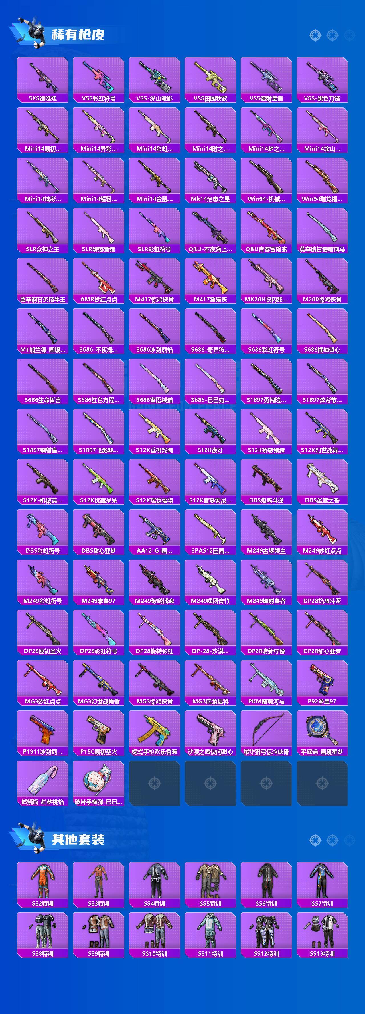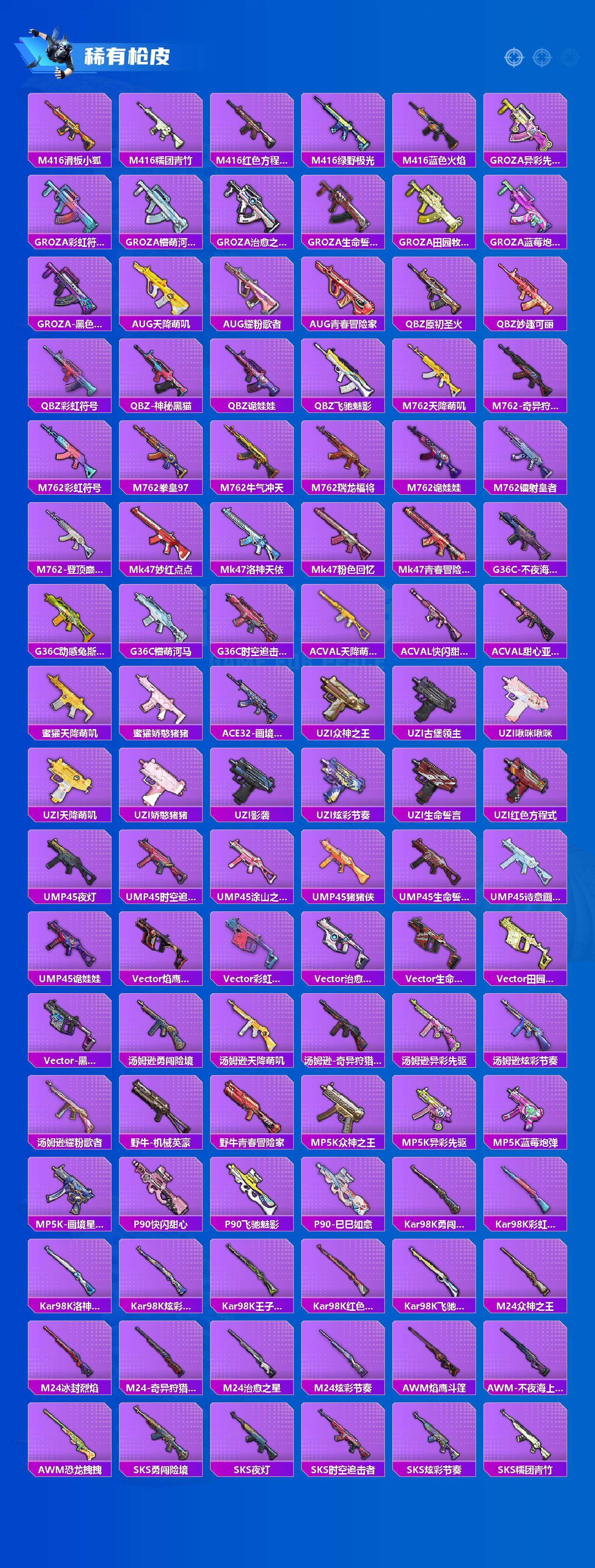 【稀有枪皮】:AUG-冰晶雪宝,AKM-冰凉西瓜,AKM-夜灯,AKM-奇异狩猎者,AKM-彩虹符号,AKM-星之彼岸,AKM-灼热熔岩,AKM-虎虎生威,AKM-霓虹街区,AKM-龙的传人,M16A4-夜灯,M16A4-幻世战舞者,M16A4-机械英豪,M16A4-甜心亚梦,M16A4-红色方程式,M16A4-蓝色火焰,M16A4-千金淑猫,SCAR-L-炫彩节奏,SCAR-L-玉兔迎春,SCAR-L-红色方程式,SCAR-L-黄金龙骨,M416-仓鼠灰灰,M4