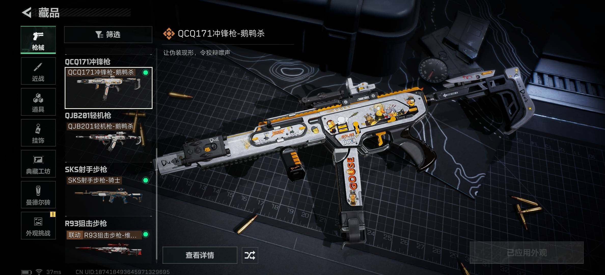【稀有外观】:AKM突击步枪-肃杀,AUG突击步枪-指挥官,M7战斗步枪-捣蛋鬼,腾龙突击步枪-冰天雪地,MP5冲锋枪-弄臣,MP5冲锋枪-哈夫克卫队,MP5冲锋枪-精英联盟,P90冲锋枪-黄昏,P90冲锋枪-捣蛋鬼,UZI冲锋枪-精英联盟,UZI冲锋枪-亚特兰蒂斯,SMG-45-行动开启,勇士冲锋枪-冰天雪地,QJB201轻机枪-哈夫克卫队,SKS射手步枪-弄臣